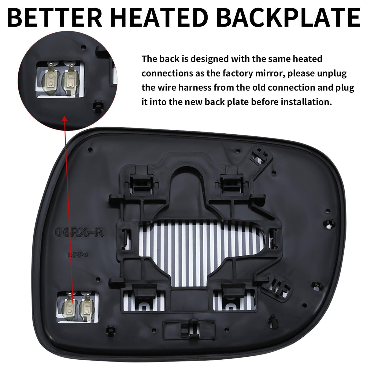 Q: Does this mirror glass have a heated function?A: Yes, the passenger side mirror glass is equipped with a heated function that helps eliminate fog and melts ice and snow by generating warmth from the inside.