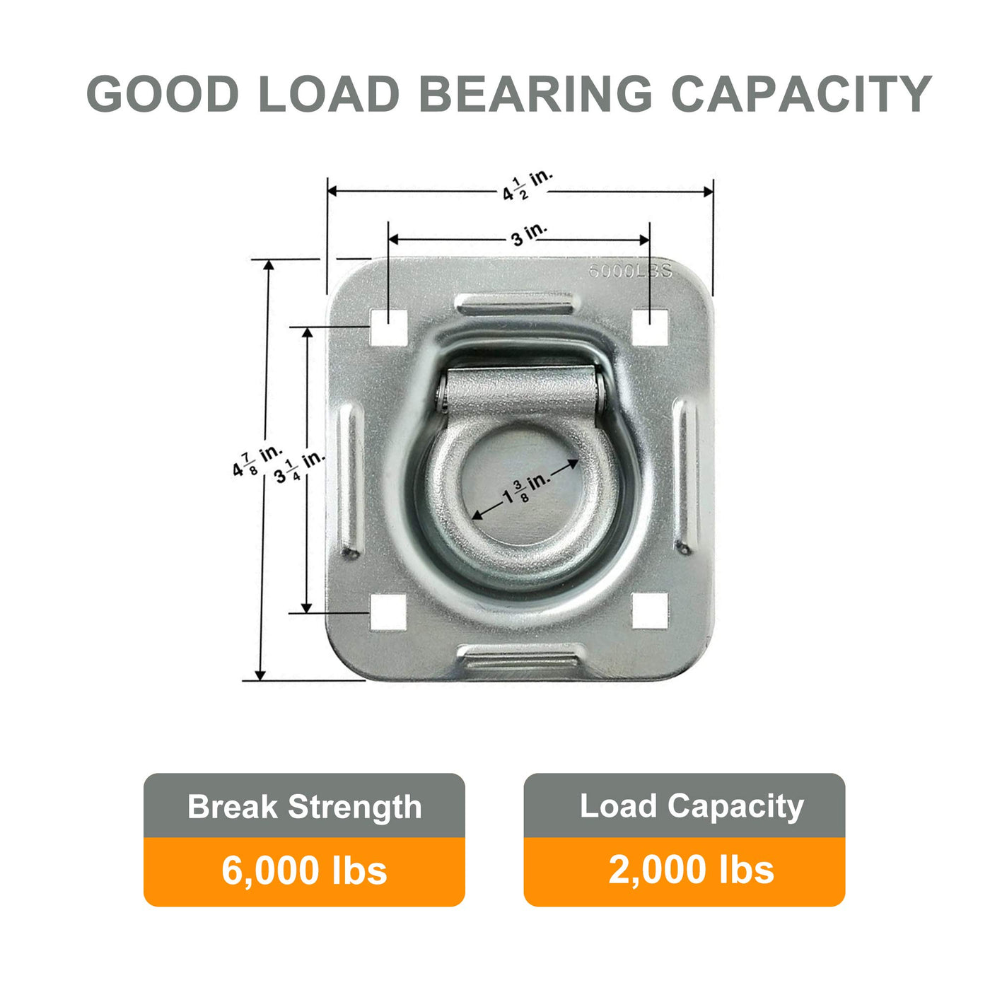 Q: What is the weight capacity of the Lonffery D-Ring Tie Down Anchors?A: The Lonffery D-Ring Tie Down Anchors have a remarkable break strength of 6,000 lbs, making them suitable for securing heavy loads during transport.