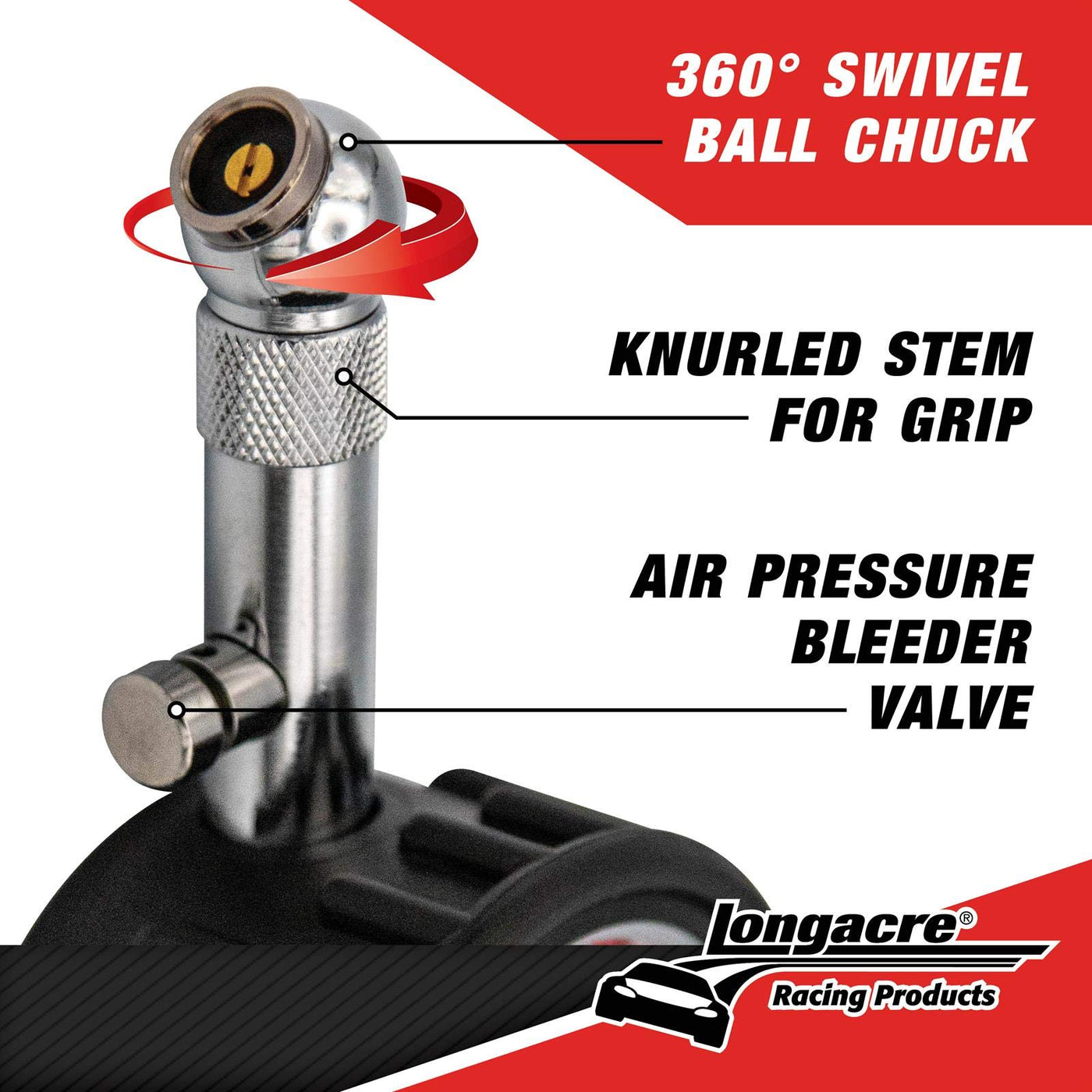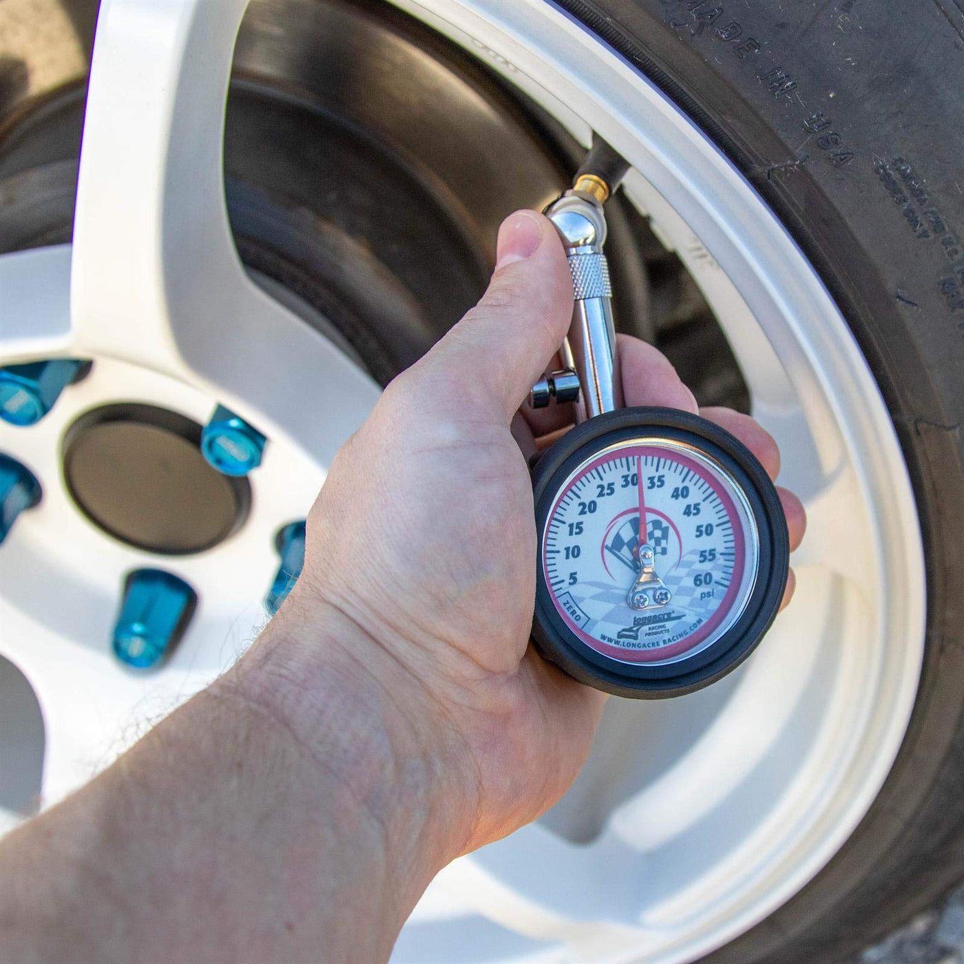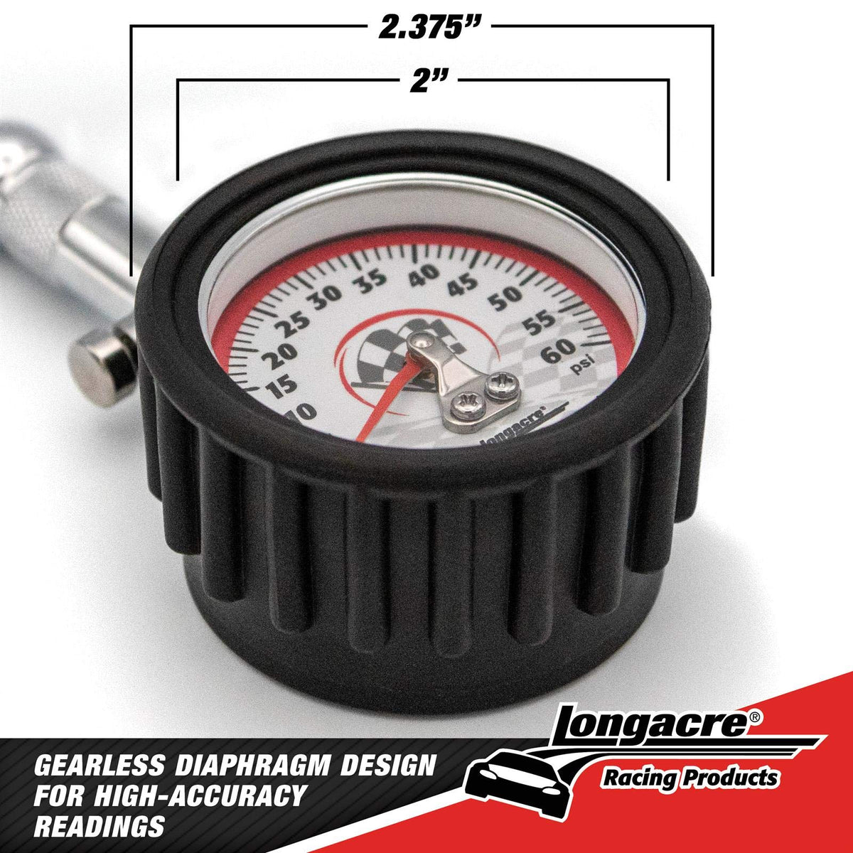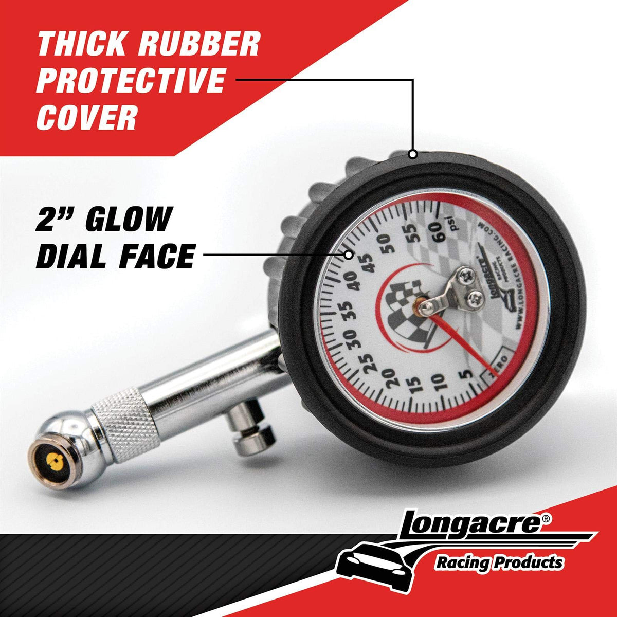 Tire Pressure Gauge - fixed stem, includes swivel ball-chuck. High visibility - the large 2" glow-in-the-dark face makes this Longacre tire pressure gauge easy to read and use any time of the day or night. This analog tire pressure gauge reads 0-60 psi, includes a high flow air pressure release button, and holds pressure readings until released. The high flow air pressure release button will help drop the pressure to your desired level and reduce pressure in overinflated tires. Engineered for the best in precision - the gearless diaphragm design provides high-accuracy readings and improves shock resistance. The 360 degree swivel chuck allows for the display face to be viewed clearly from any angle; the knurled stem provides better grip during use. Note: Does not hold pressure reading once pressure is removed