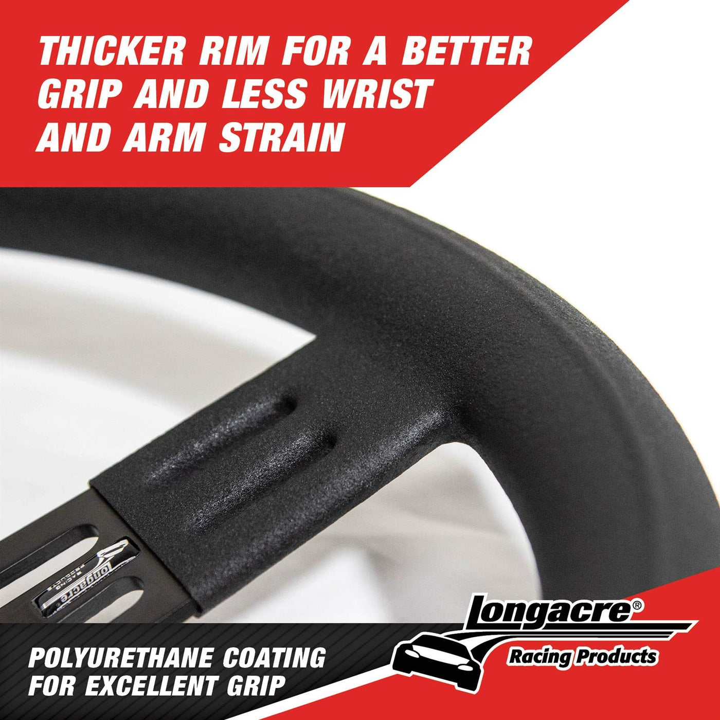 Q: What is the dish depth of the Longacre steering wheel and how does it affect usability?A: The Longacre steering wheel has a dish depth of 2-3/4 inches. This depth provides an ergonomic grip and allows for better hand positioning, which can enhance control and steering response during races.