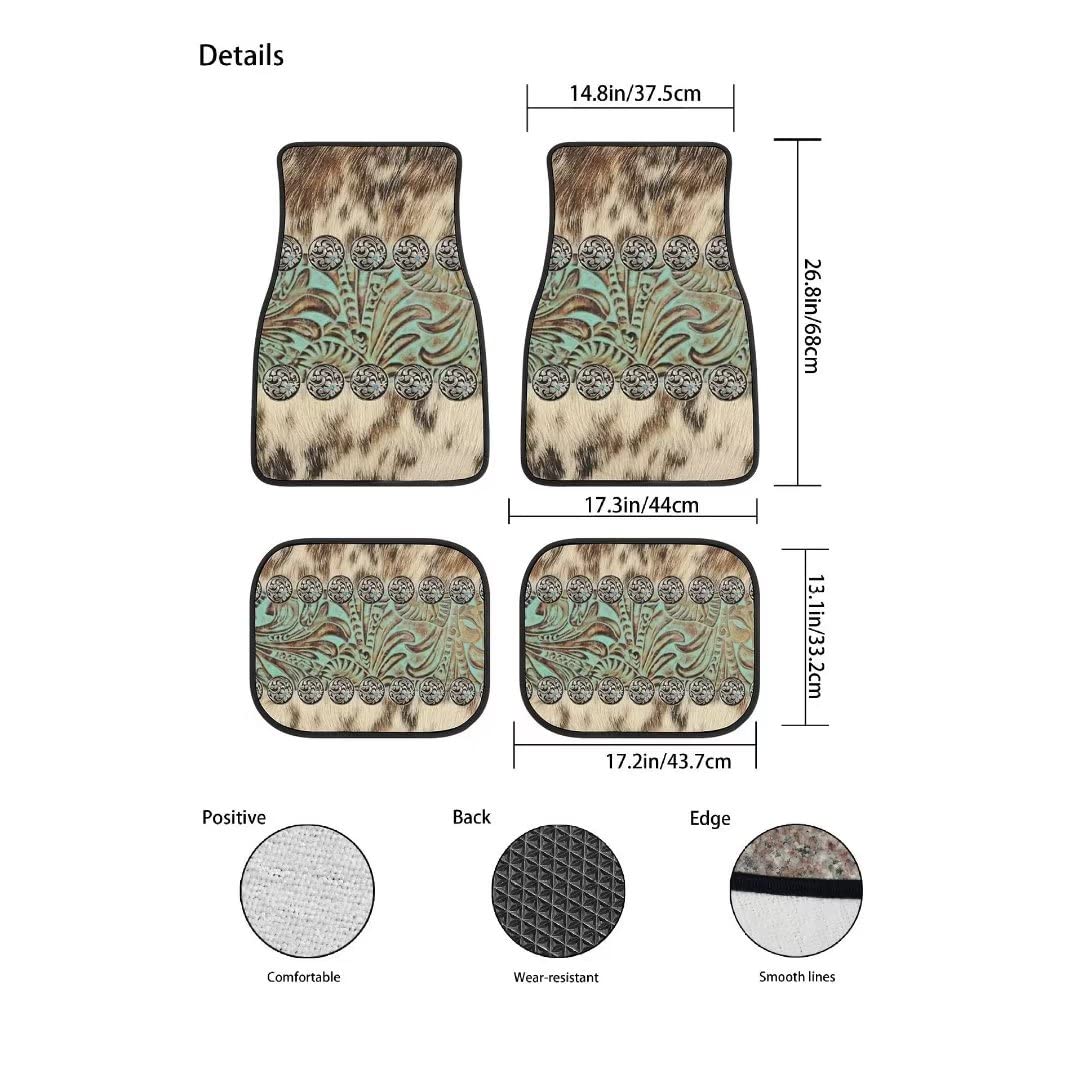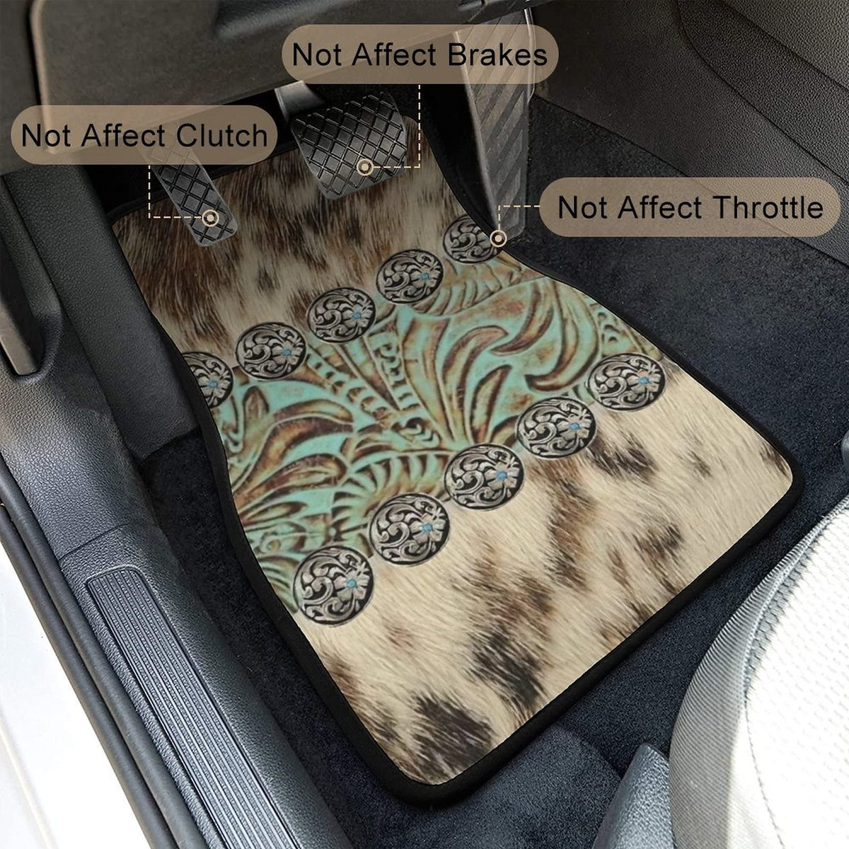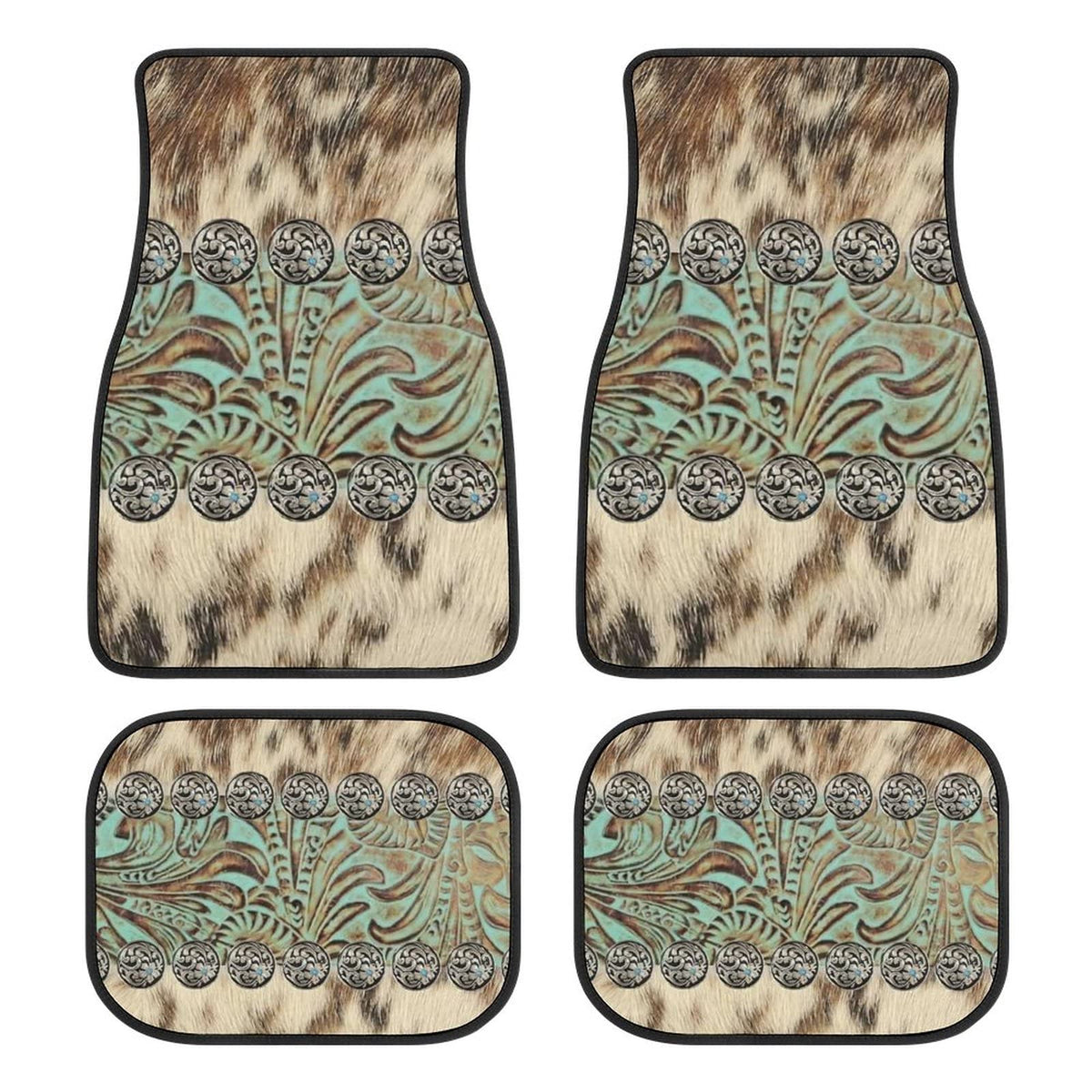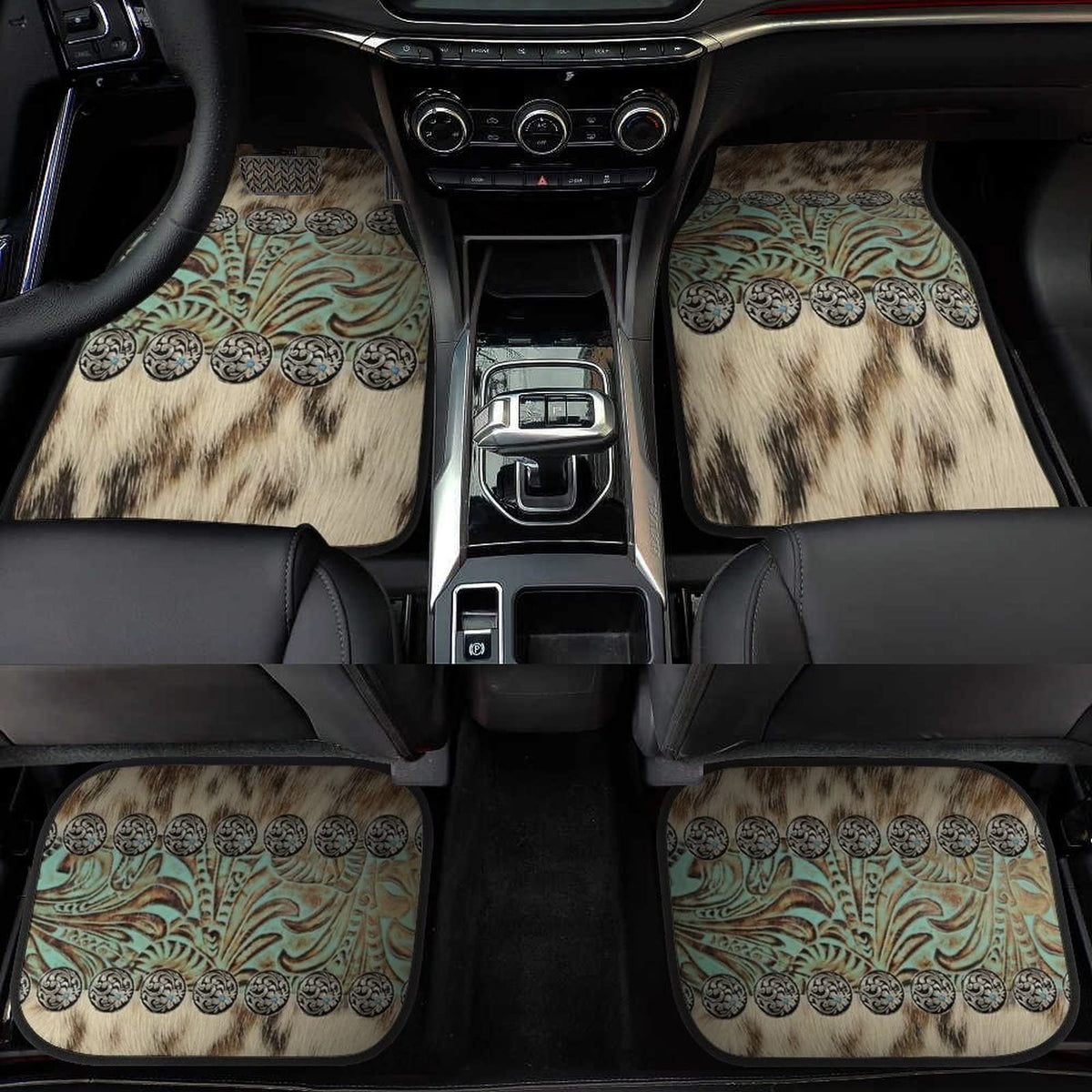LONSANT Universal Car Floor Mats Set of 4,Rustic Brown Beige Teal Western Country Cowboy Tooled Leather Vehicle Front Rear Carpe