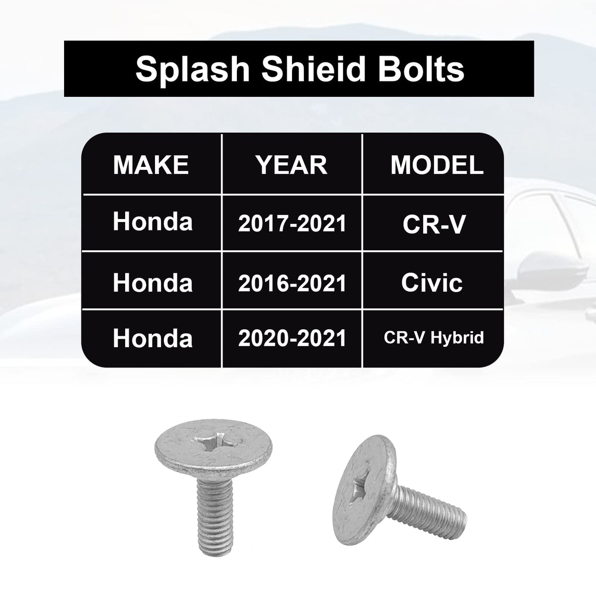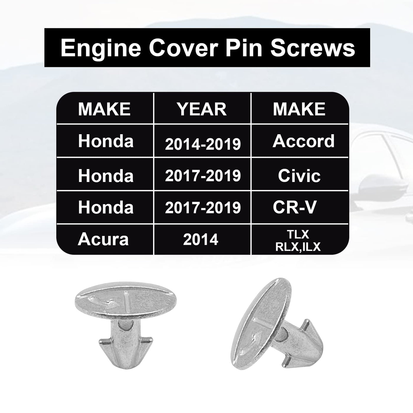 Q: What vehicles are compatible with the Lower Engine Cover Bolt Pin Screws?A: The Lower Engine Cover Bolt Pin Screws are compatible with Honda Accord (2014-2019), Honda Civic (2017-2019), Honda CR-V (2017-2019), and Acura models TLX, RLX, and ILX.