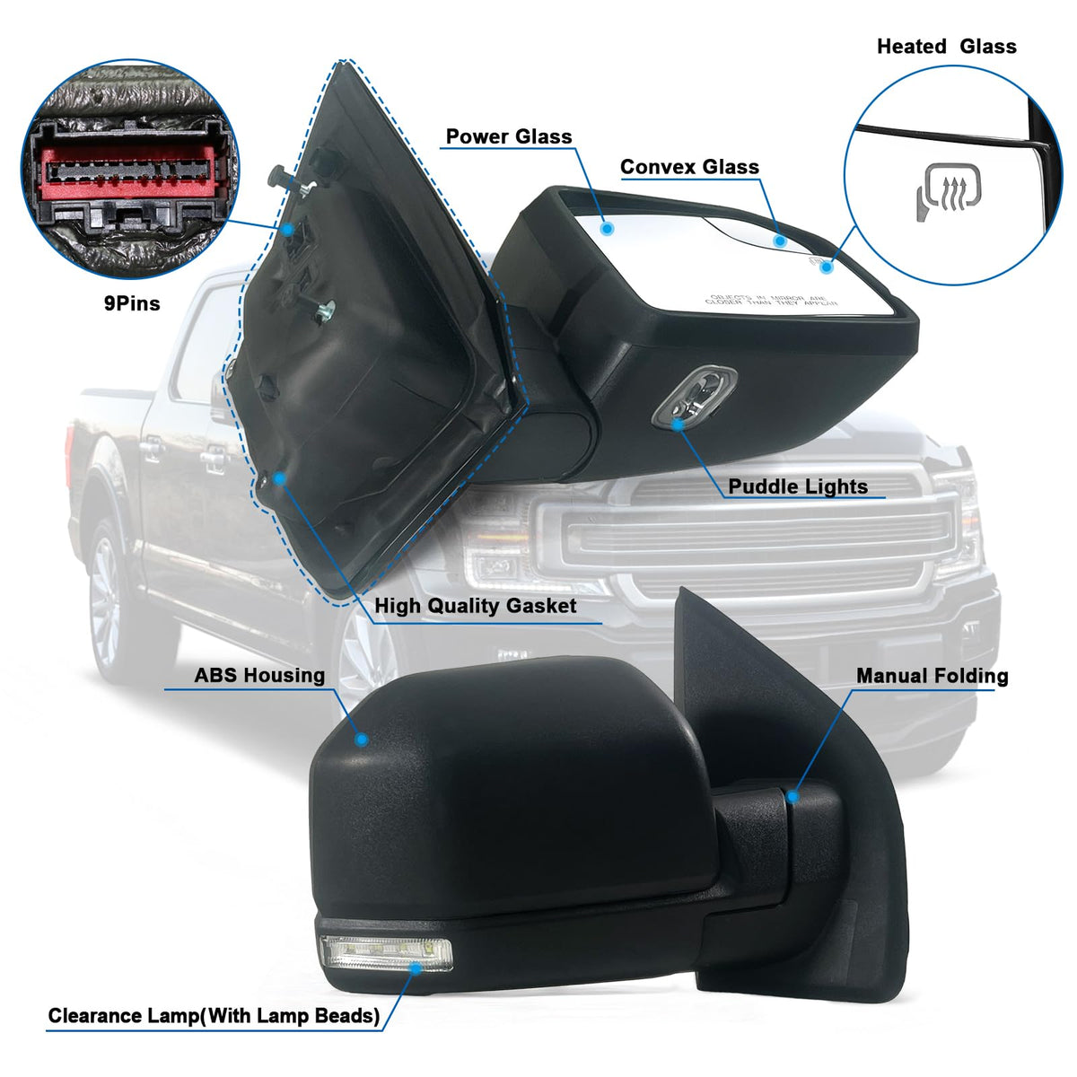 Lqito Right Passenger side Mirror with Power Glass,Heated, Puddle Lights,Clearnce Lamp and Manual Folding Fits 2015-2020 Ford F1