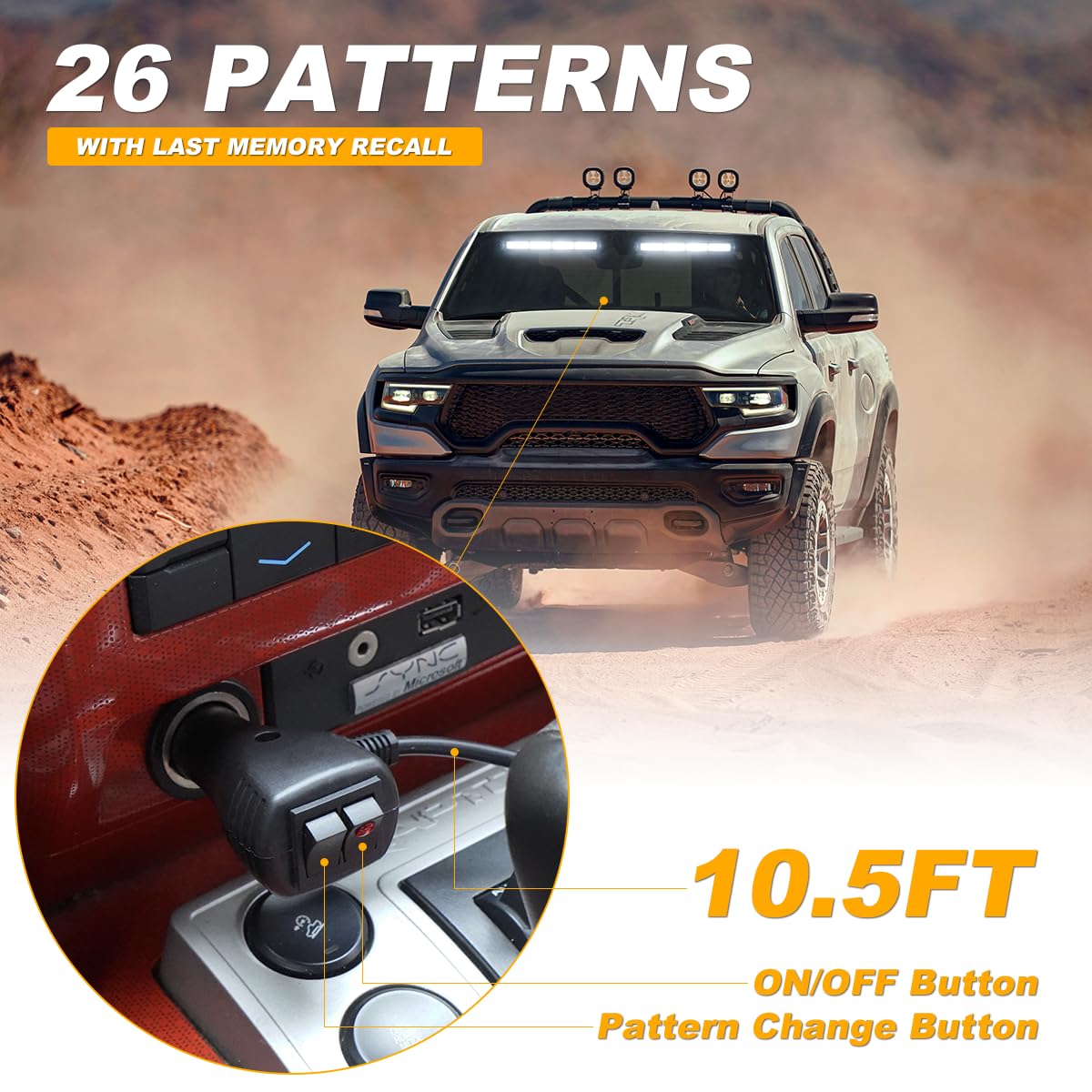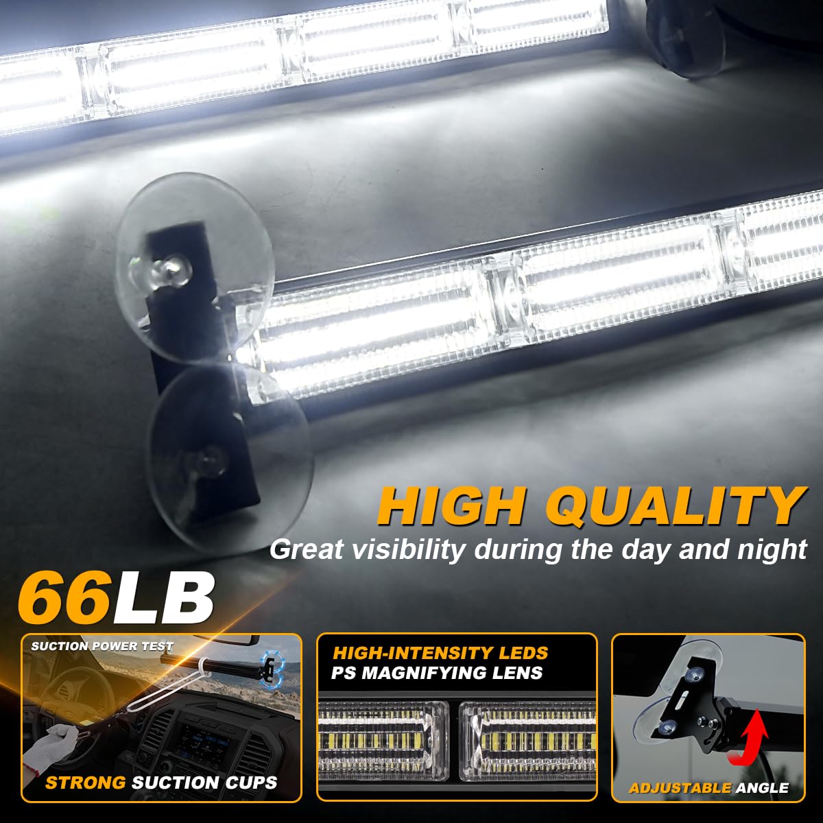 ???SAFEGUARD YOUR SECURITY?LRTER windshield strobe lights are bright and visible from pretty far out. Good visibility during daylight without the high glare at night. When you are in trouble or take part in search and rescue efforts, turn on the warning flash lights, and the people will notice your vehicle from a distance. Great for safety in an emergency! | ???SUPER VISIBLE?With PS magnifying lens and high-Iintensity LEDs, our emergency traffic advisor light bars are 5 times brighter than others. Even during the day time, these windshield strobe lights are plenty visible to drivers. Visibility during daylight hours is excellent, and you can get considerable visibility during nighttime hours. | ???26 FLASH PATTERNS?With cigarette lighter plug, our emergency warning lights bar have 26 patterns to choose from for many different uses and last pattern recall/memory function. Plug and play & quick reponse.Well made and absolutely draw attention. | ???MORE THAN 50000HRS LIFESPAN?Made of high high-quality aluminum alloy housing, LRTER warning flashing safety lights have a superb heat dissipation performance, which guarantee stable and dependable LED illumination and prolongs the lifespan of LEDs. | ???EASY INSTALLATION?3mins quickly install. Our emergency strobe light bar can be install on rear window, front windshield, and exterior of vehicles. In order to make the product work better, please make sure the surface is clean and dry. | ???5 TIMES STRONGER ADSORPTION THAN OTHERS?The suction cups can work in different temperature, stay in place well and hold tight without slipping or sliding or falling. We have attached strong double-sided adhesive tapes for better adhesion, say goodbye to ''FALLING OFF''. | ???WIDE APPLICABLITY?Universal for 12-24V all vehicles, widely used for Hazards Warning, Law Enforcement, First Responder, emergency cars and trucks, construction vehicles, police, safety, security, snowplow, postal and city service workers, etc.