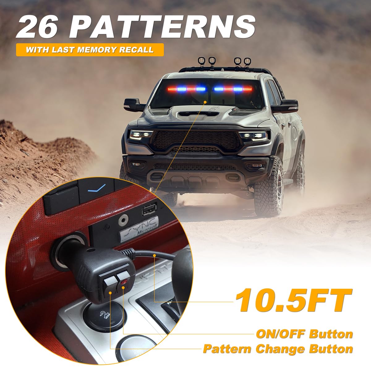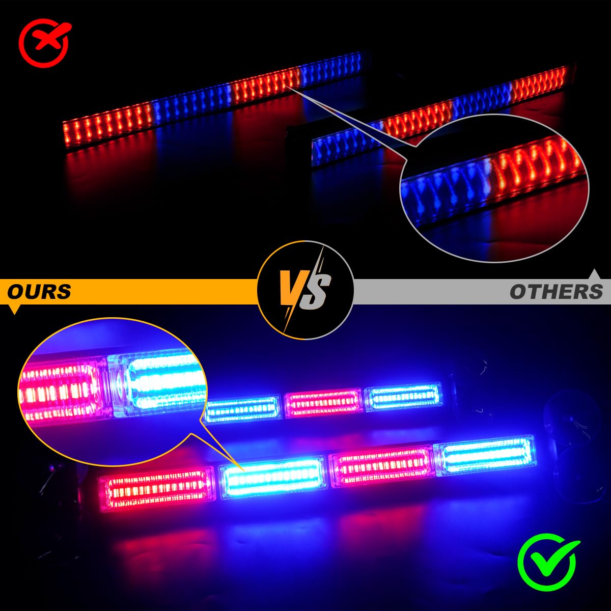 ???SAFEGUARD YOUR SECURITY?LRTER windshield strobe lights are bright and visible from pretty far out. Good visibility during daylight without the high glare at night. When you are in trouble or take part in search and rescue efforts, turn on the warning flash lights, and the people will notice your vehicle from a distance. Great for safety in an emergency! | ???SUPER VISIBLE?With PS magnifying lens and high-Iintensity LEDs, our emergency traffic advisor light bars are 5 times brighter than others. Even during the day time, these windshield strobe lights are plenty visible to drivers. Visibility during daylight hours is excellent, and you can get considerable visibility during nighttime hours. | ???26 FLASH PATTERNS?With cigarette lighter plug, our emergency warning lights bar have 26 patterns to choose from for many different uses and last pattern recall/memory function. Plug and play & quick reponse.Well made and absolutely draw attention. | ???MORE THAN 50000HRS LIFESPAN?Made of high high-quality aluminum alloy housing, LRTER warning flashing safety lights have a superb heat dissipation performance, which guarantee stable and dependable LED illumination and prolongs the lifespan of LEDs. | ???EASY INSTALLATION?3mins quickly install. Our emergency strobe light bar can be install on rear window, front windshield, and exterior of vehicles. In order to make the product work better, please make sure the surface is clean and dry. | ???5 TIMES STRONGER ADSORPTION THAN OTHERS?The suction cups can work in different temperature, stay in place well and hold tight without slipping or sliding or falling. We have attached strong double-sided adhesive tapes for better adhesion, say goodbye to ''FALLING OFF''. | ???WIDE APPLICABLITY?Universal for 12-24V all vehicles, widely used for Hazards Warning, Law Enforcement, First Responder, emergency cars and trucks, construction vehicles, police, safety, security, snowplow, postal and city service workers, etc.