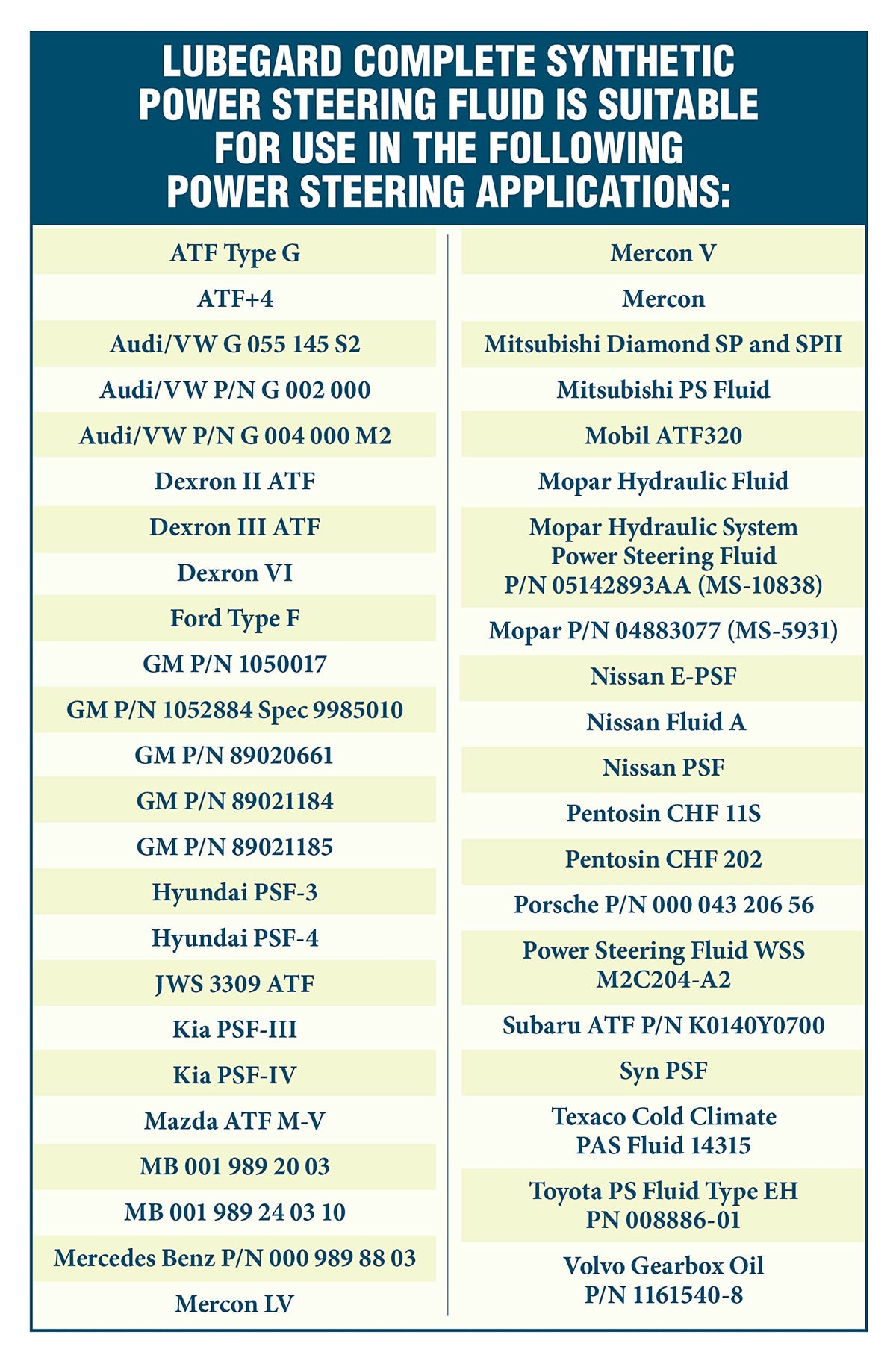 LUBEGARD Synthetic Power Steering Fluid is the high quality service solution for ALL European, North American, and Asian Vehicles (Honda fluid is recommended for Honda/Acura vehicles). This fluid is formulated with a superior base synthetic oil and a proprietary additive package that includes 2 patented technologies: SynergolTMS and LXE. Together these technologies provide the most advanced anti-wear protection available. SynergolTMS is the first non-active, phosphorous-free surface molecule composed solely of carbon, hydrogen and oxygen. It contains no other toxic, corrosive, metallic or polluting elements. As an extended life anti-wear material, it extends far beyond normal power steering fluid in safeguarding system components. LXE (Liquid Wax Ester) has a molecular structure that allows unsurpassed heat transfer making LUBEGARD Synthetic Power Steering Fluid the most heat stable power steering product sold. The combination of these two technologies in a synthetic base prolongs the life of the power steering system unit and makes the operation smoother and less stiff. In third party testing, LUBEGARD Synthetic Power Steering Fluid outperformed competitive power steering fluids in three important ways: 1) Superior anti-wear formula significantly reduces friction, provides more potent rust and corrosion protection and extends the life of the power steering unit. 2) Effective in a wider range of temperatures (-41oF to 130oF) providing excellent cold and high temperature performance. 3) Protects seals and hoses reducing the risk of power steering leaks and prolonging the life of the parts.