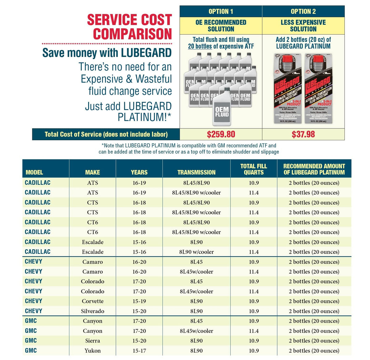 Q: Can Lubegard Platinum be used with any type of ATF?A: Lubegard Platinum is compatible with most OEM ATF types but should not be used with Ford Type F ATF or in CVTs. Always refer to the LUBEGARD ATF Conversion & Refill Chart for proper conversions.