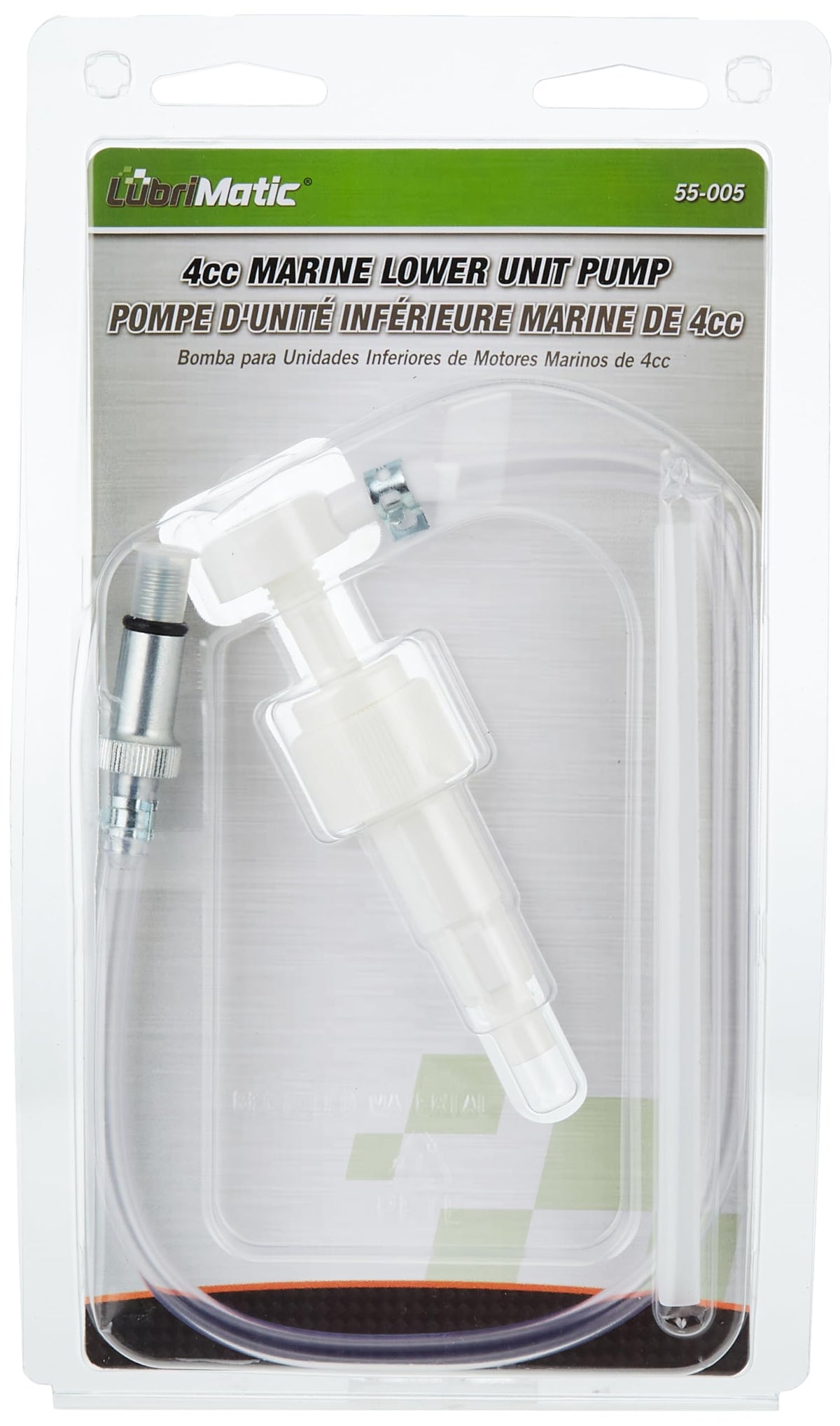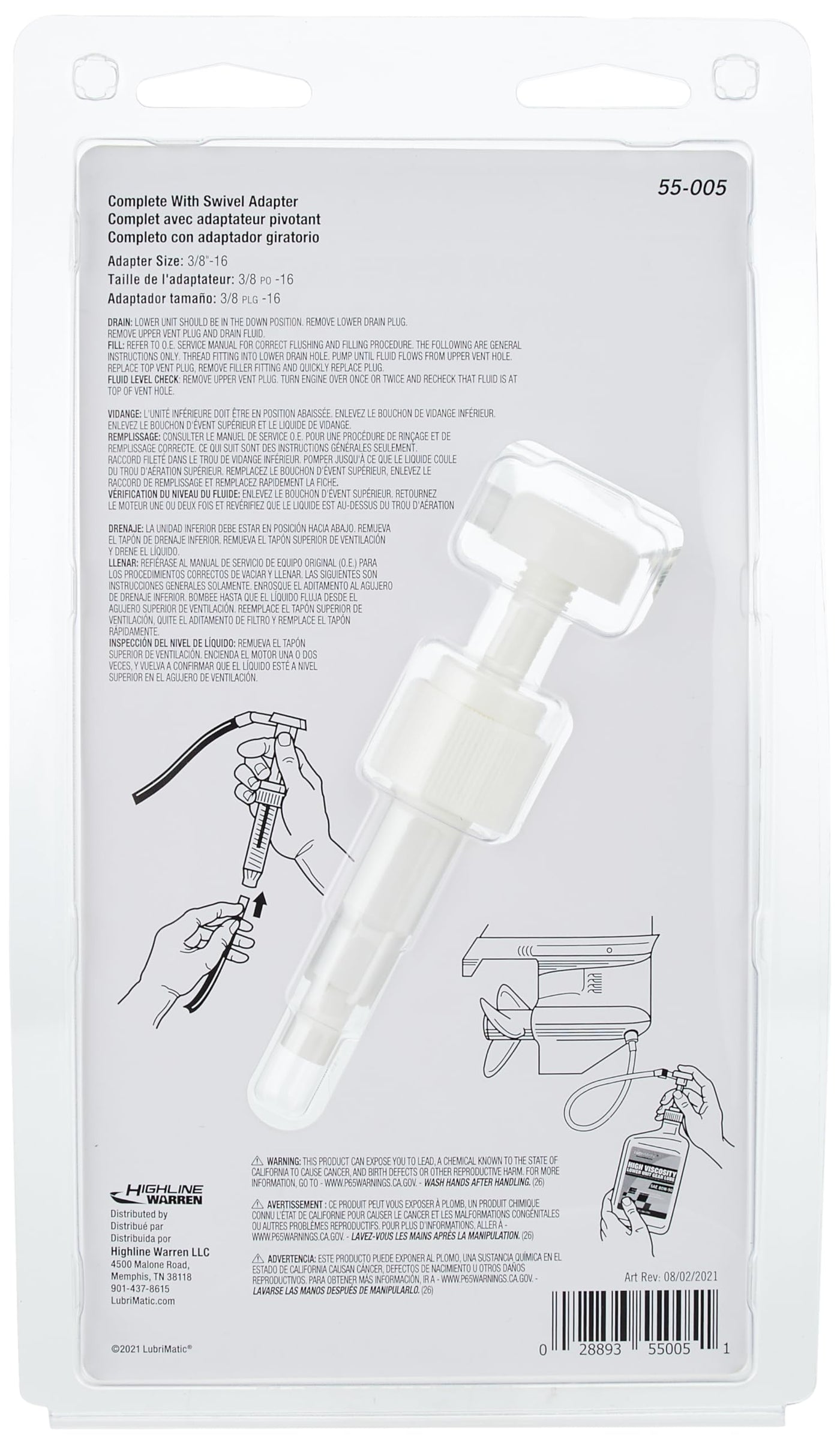 Avoid the mess of changing out fluids with our leak-free pump! Our LubriMatic 55-005 Fluid & Oil Transfer Pump is a simple and effective solution for adding fluids to small engines, automotive transmissions and axles, farm equipment, and industrial equipment, and is ideal for adding oil and other fluids, such as antifreeze, fuel, steering fluid, or gear lube, to small engines and marine lower units. Avoid messy spills and the hassle transferring fluids to your engine or other equipment. The LubriMatic 55-005 threads securely onto quart sized bottles and containers with traditional sized necks as commonly used for motor oil, ATF, and gear lube, however, it is not compatible with bottles that have oversize or wide-mouth necks. The LubriMatic 55-005 transfers fluid at 4ccs per stroke. Great for hard to reach places. Are you tired of wrestling with your average hand pump, trying desperately to fit it into tight spaces and awkward nooks and crannies? The LubriMatic 55-005 includes a long, 17 inch, 3/8 inch diameter flexible outlet hose that allows for easy access to hard to reach fill plugs and tubes. The stiff, rigid construction of the inlet tubes ensures that no clogs or obstructions will keep your fluids from pouring smoothly, and the inlet tubes won't curl like flexible tubes, ensuring a more complete fluid transfer. Professional quality that you can count on. For over 40 years, LubriMatic has been developing and distributing superior lubrication equipment, and we are proud to supply equipment to the industrial, hardware, marine, automotive and agricultural markets, as well as many industries requiring professional grade lubricants and penetrants.