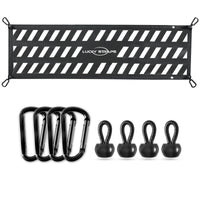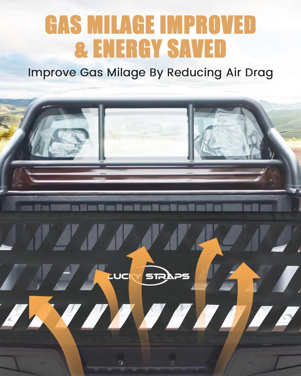 LuckyStraps 50 x 15 Easy-to-use Truck Tailgate Net with Excellent UV Protection EASY TO INSTALL OR REMOVE No tools are required! Just attach the four carabiner hooks to the anchors on your truck's tailgate. EXCELLENT UV PROTECTION The polyester material with the best UV resistance is used to greatly extend the lifespan of outdoor use. SAVE ON FUEL & ENVIRONMENT FRIENDLY LuckyStraps tailgates net can increase gas mileage by reducing air drag. WIDELY USED The heavy-duty pickup truck tailgate netting can be used to secure not only kayaks and motorcycles, but also cargo, moving furniture, cabinets, etc. EXCELLENT AFTER-SALES SERVICE 2-year warranty and 30-day free return or exchange policy. WHAT YOU GET Tailgate Net x 1; Carabiner Hook x 4; Ball Bungee Cord x 4.