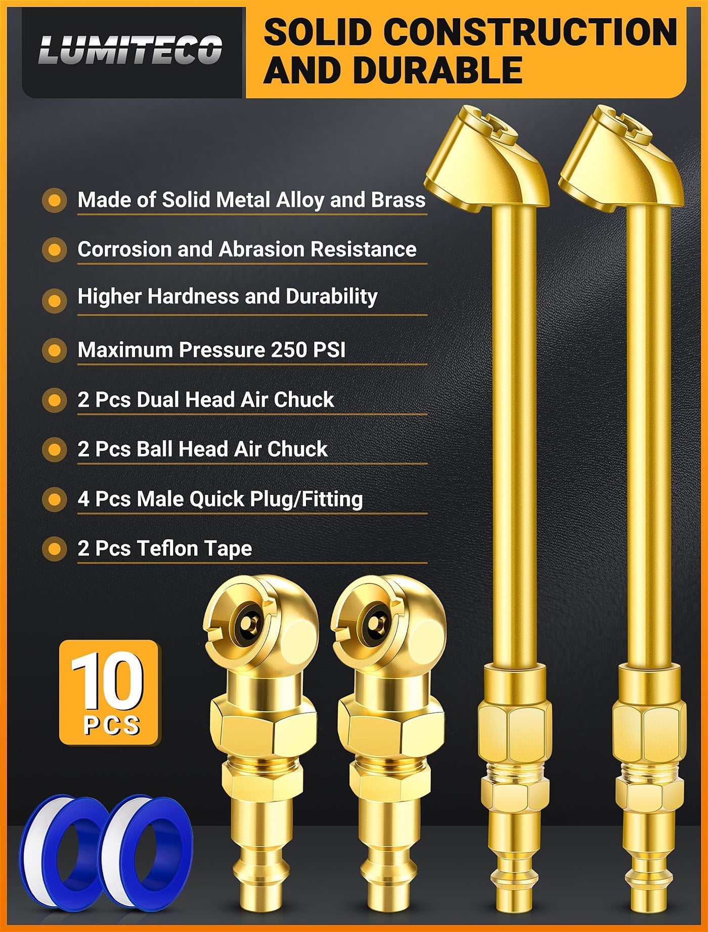 This LUMITECO Heavy Duty Air Chuck Set including a 1/4'' FNPT closed ball air chuck, a 1/4'' FNPT dual head tire chuck and a 1/4'' male quick plug, portable and easy to storage, universal applied for trucks, buses, cars, motorcycles, bicycles, etc.