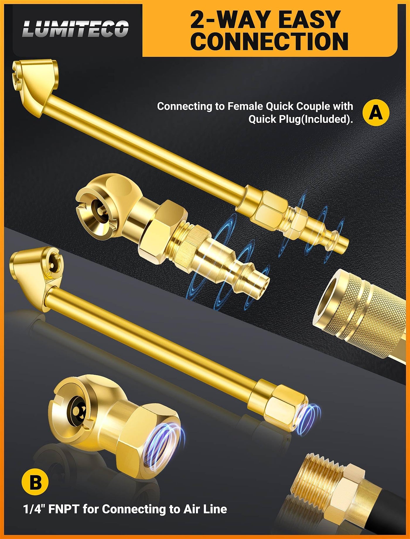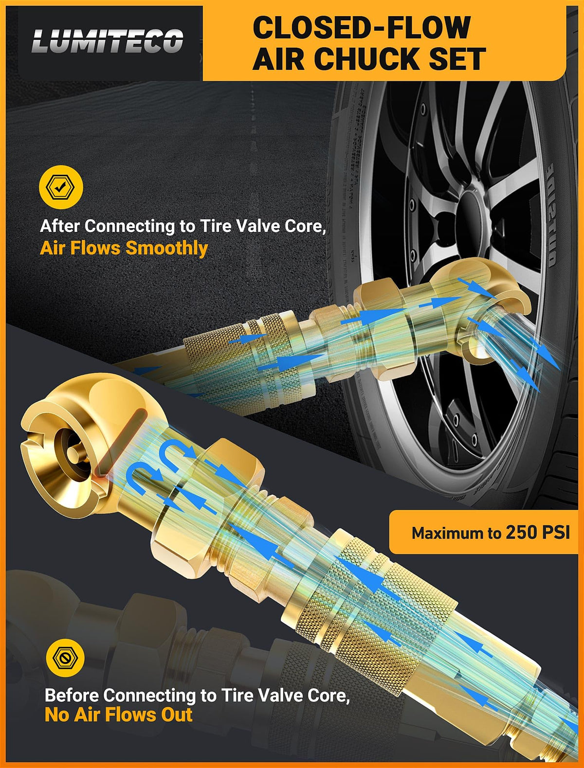 LUMITECO 2 Pack Heavy Duty Air Chuck Set-1/4 Inch Female NPT Closed Ball tire Chuck, Dual Head Air Chuck and Standard Male Quick