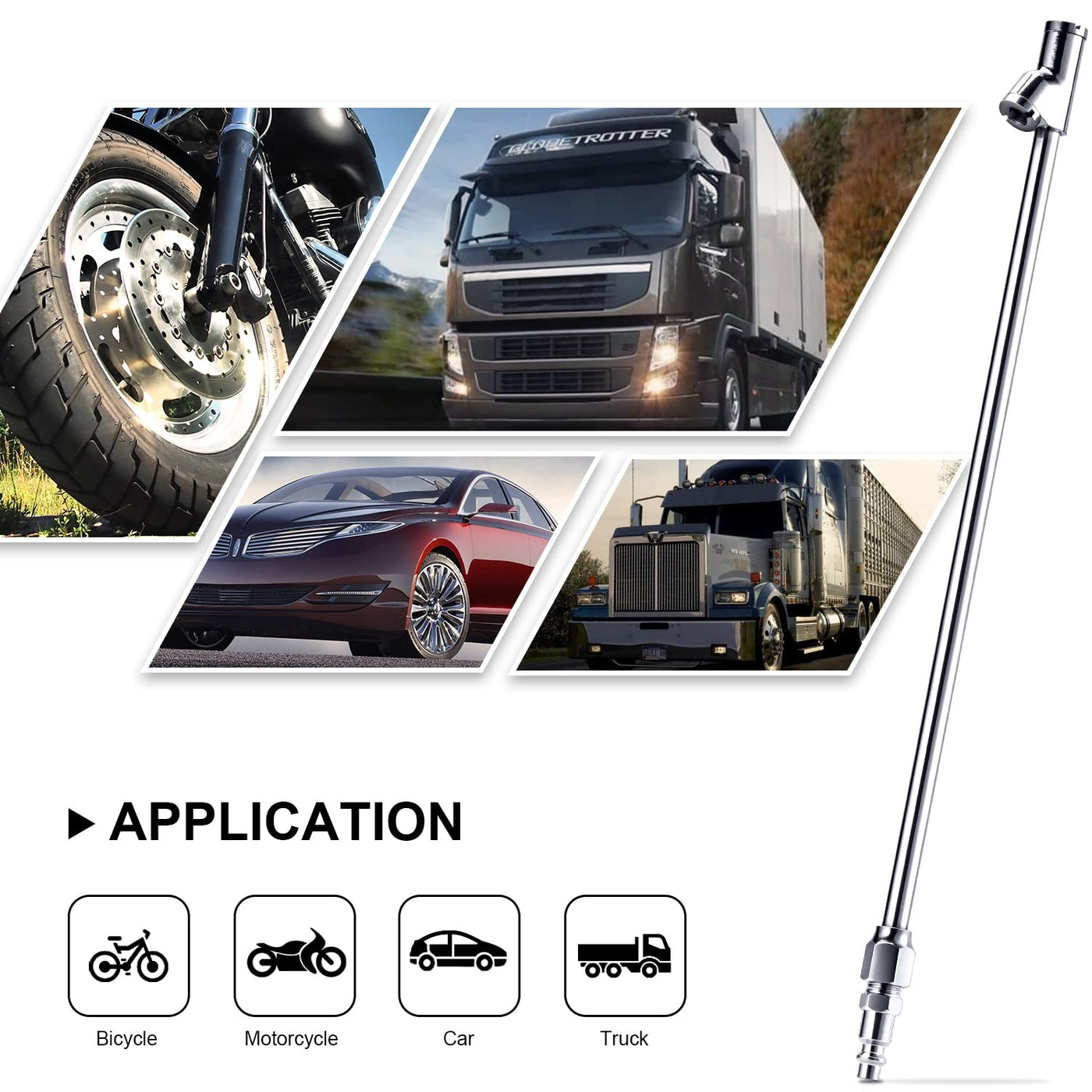 ?What in the box? 1 pcs 1/4'' FNPT Extended Reach Dual Head Tire chuck 1 pcs standard male quick plug 1pcs teflon tape bonus ?Why this air chuck set? Quality Made, high quality metal alloy air chuck with standard quick plug, will serve you faithfully for years. 2-way Easy Connection, female 1/4'' FNPT thread for connecting to air compressor's air line, standard 1/4'' male quick plug for connecting to air lines' female quick couple. Extended Reach & Dual Head Inner Thread Design, 12'' lengthened air rod for hard-to-reach tire valves, and quality Inner Thread lock design dual head, especially designed for truck or RV's dual wheel. Wide Application, Ideal for schrader valve, widely applicable for various vehicles, bikes, motorcycle, car, etc. ?How to make a better operation? put it on tire valve stem then push and lean it slightly to ensure no air leakage and easy one-hand operation. align it back straight to the valve stem to take it off.