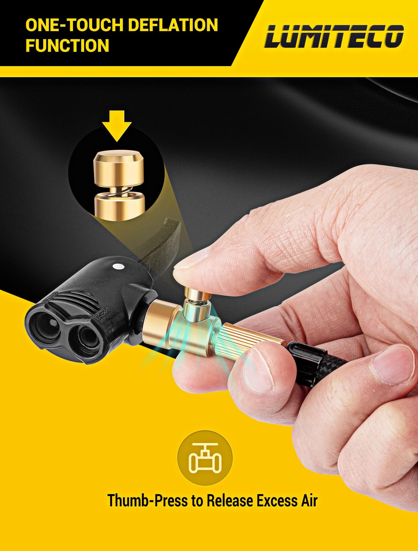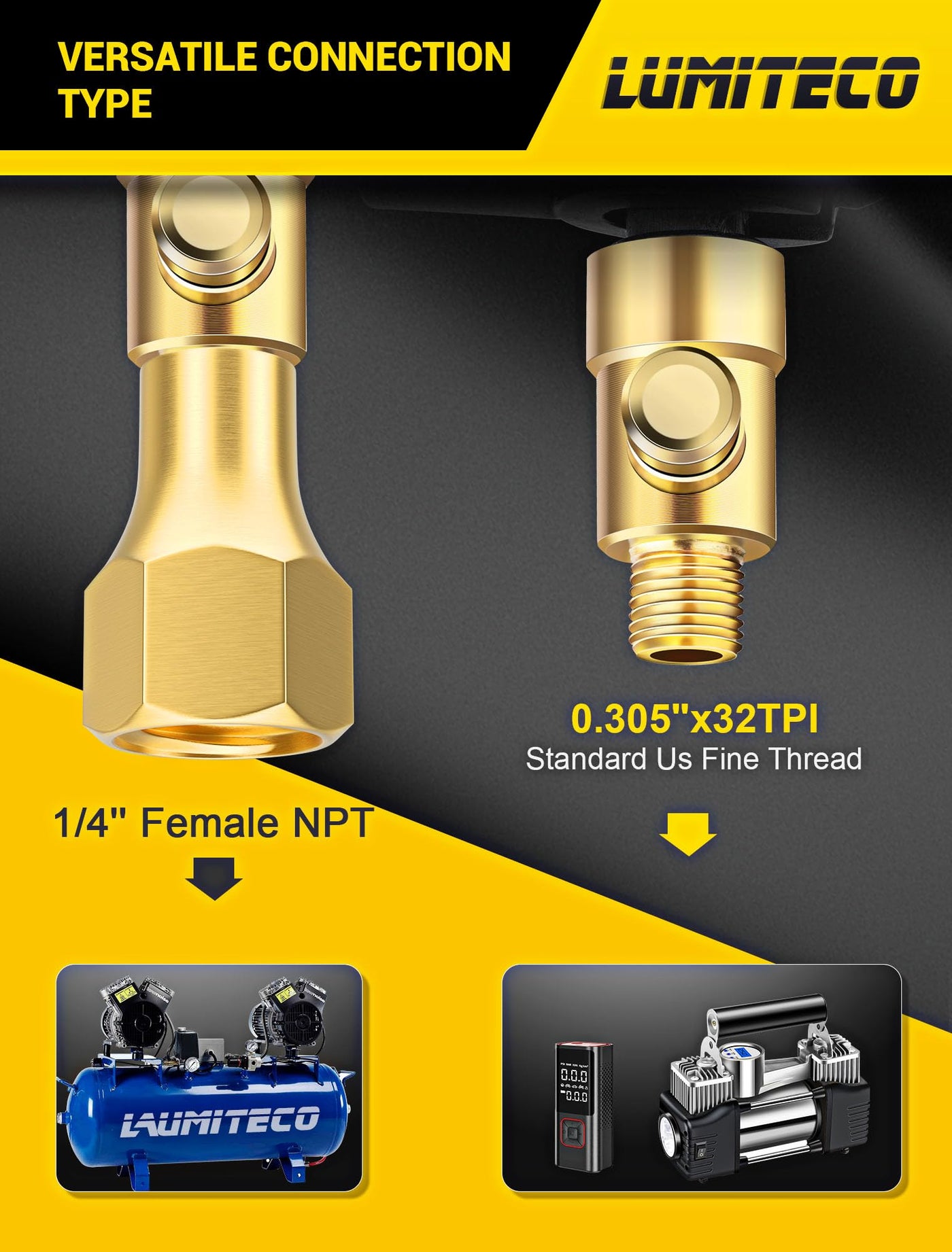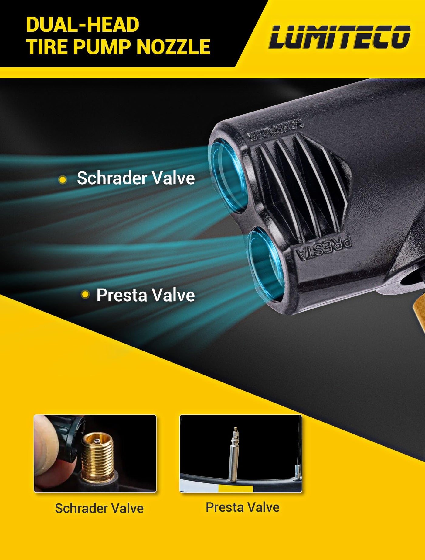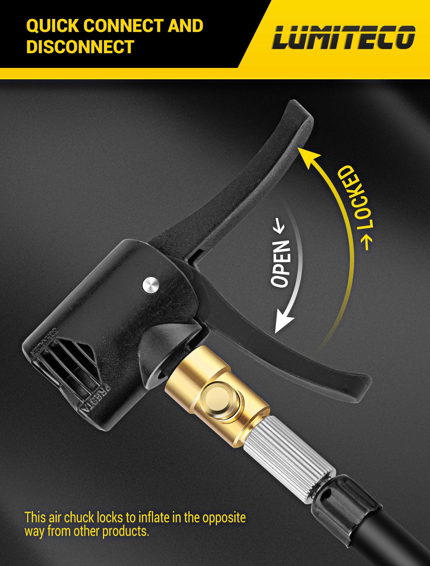 LUMITECO Locking Presta Schrader Air Chuck for Bike Tire, Dual Head Pump Nozzle with 1/4'' F-NPT Quick Connect for Tire Inflator, Presta&Schrader Valve Adapter w/Air Release Nob for Bicycle Floor Pump ?VERSATILE CONNECTION TYPE?LUMITECO double mouth air chuck is universal for Presta valves and Schrader valves. Threaded end can be used as an accessory for most 12V portable air compressors. Also comes with 1/4'' Female NPT to use with portable tire inflator gauges and standard 1/4'' NPT fittings (see product images). ?ONE-TOUCH DEFLATION FUNCTION?This portable tire inflator chuck adapter features an air pressure release bleeder on air nozzle that makes deflating quick and simple. With just a press, rapidly release excess air and achieve fast deflation of tires, saving time and increasing work efficiency. ?QUICK CONNECT AND DISCONNECT?PLEASE BE SURE TO check the 2nd picture for details on ''LOCKED'' and ''OPEN''. This air chuck locks to inflate in the opposite way from other products. Insert it into the Schrader valve stem or Presta valve stem, when you open its clamp lever, it is in the locked mode, which means you can inflate the tire; When you push down the clamp lever, it is in the open mode. ?ADEQUATE AIRTIGHT SEAL?Solid construction air chuck for longevity, both ends have inner washers to ensure an airtight seal with air nozzles and tire valves. This tire inflate nozzle maintains consistent performance under frequent use, effectively prevents air leakage during inflation. ?MULTIPLE APPLICATIONS?The 1/4'' F-NPT female threaded end of the tire chuck attaches to tire inflator tools for the connection of air lines, air hose nozzles of portable compressors or tire inflator gauges. Also features standard US fine thread that same as the thread on all USA standard car valve stems for inflating most bike, motorcycle, car, truck, etc.