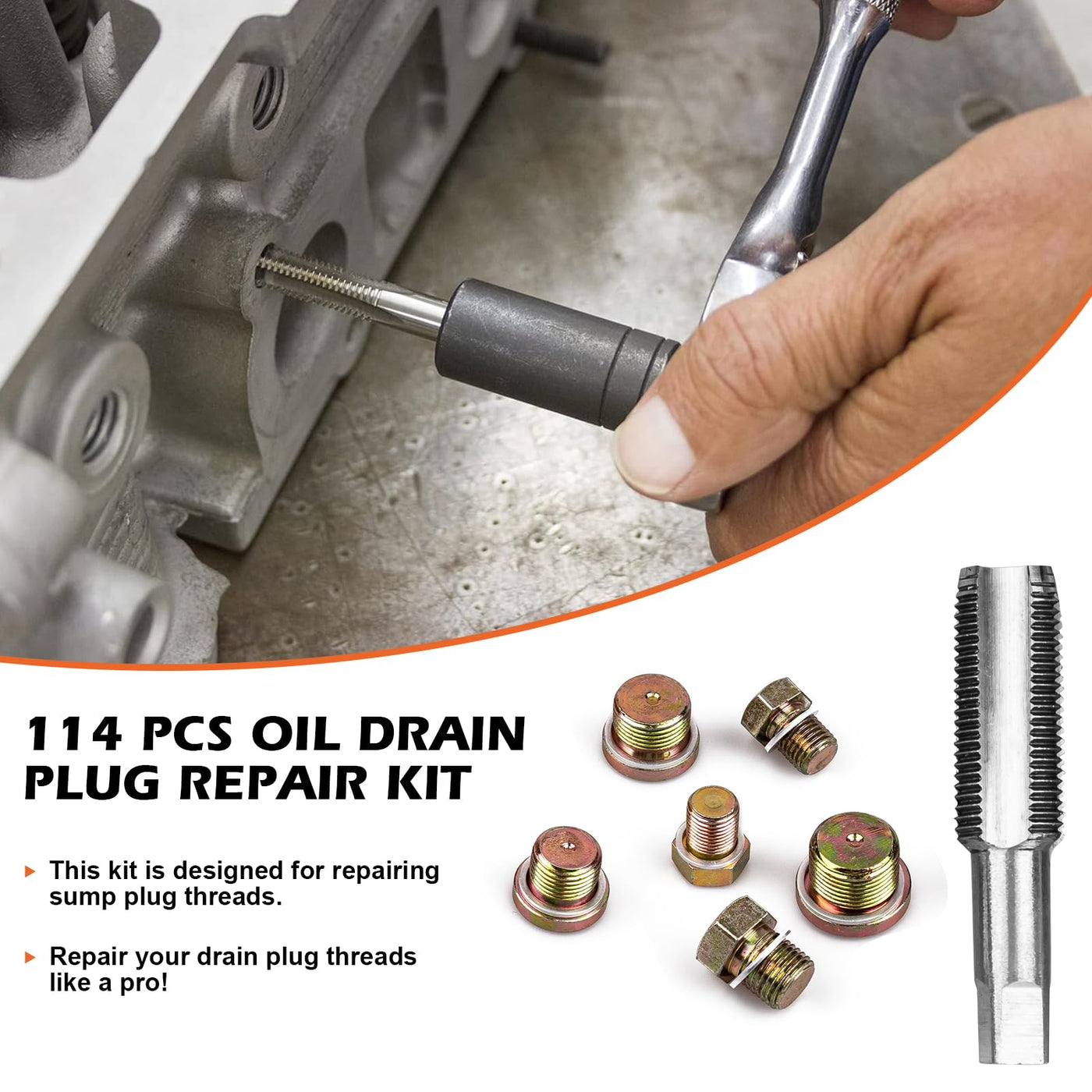 Q: How do I use the oil pan drain plug repair kit?A: To use the oil pan drain plug repair kit, first select the appropriate tap size for your oil drain pan threads. Use the taps to create new threads, then install the corresponding oil pan plug and washer for a secure fit, ensuring a leak-free seal during oil changes.