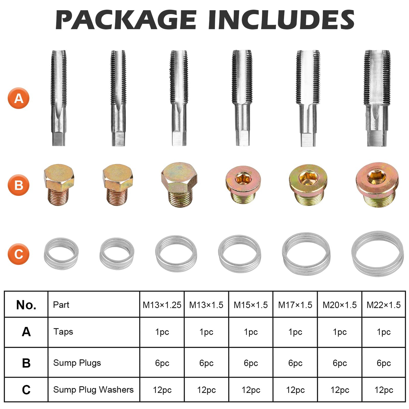 Q: What is included in the Luney 114PCS Oil Pan Drain Plug Repair Kit?A: The Luney 114PCS Oil Pan Drain Plug Repair Kit includes 6 taps (M13 × 1.25, M13 × 1.5, M15 × 1.5, M17 × 1.5, M20 × 1.5, M22 × 1.5), 36 oil pan plugs (various sizes), and 72 oil sump plug washers, providing a comprehensive solution for oil drain plug repairs.