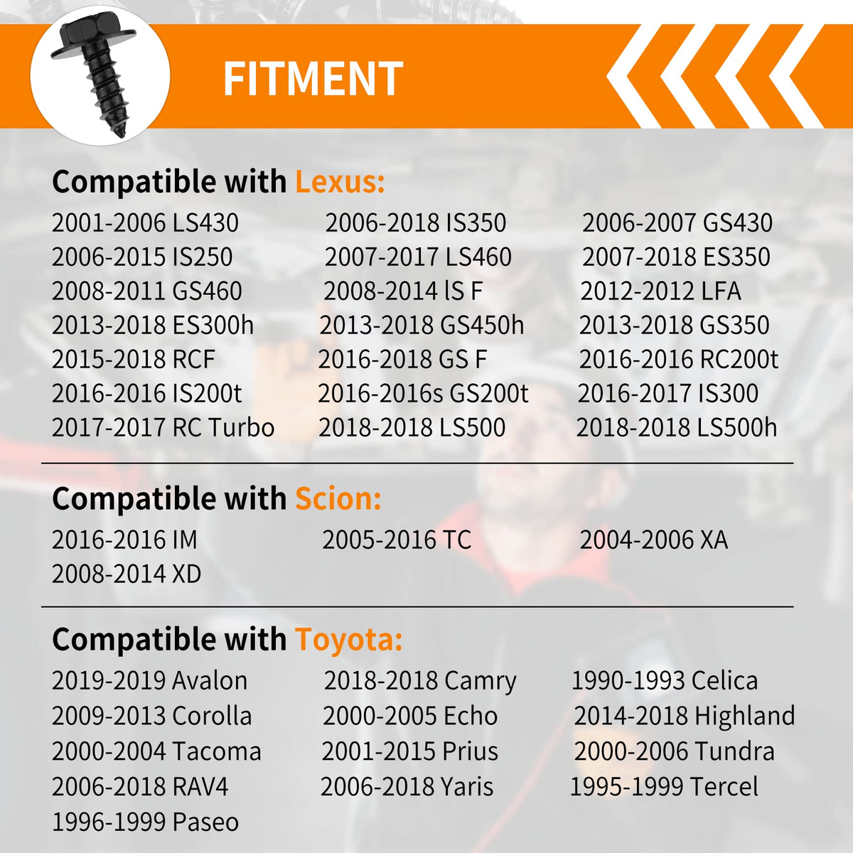 Q: What vehicles are compatible with the luxlead 30 PCS Front Fender Liner Screws Set?A: The luxlead 30 PCS Front Fender Liner Screws Set is compatible with a wide range of Toyota models including Tacoma, Prius, Corolla, Tundra, Sequoia, 4Runner, RAV4, FJ Cruiser, Yaris, Tercel, Paseo, Highlander, Avalon, and Camry. It is also suitable for various Lexus models such as ES300h, ES350, GS F, GS Turbo, IS F, LFA, and many more.