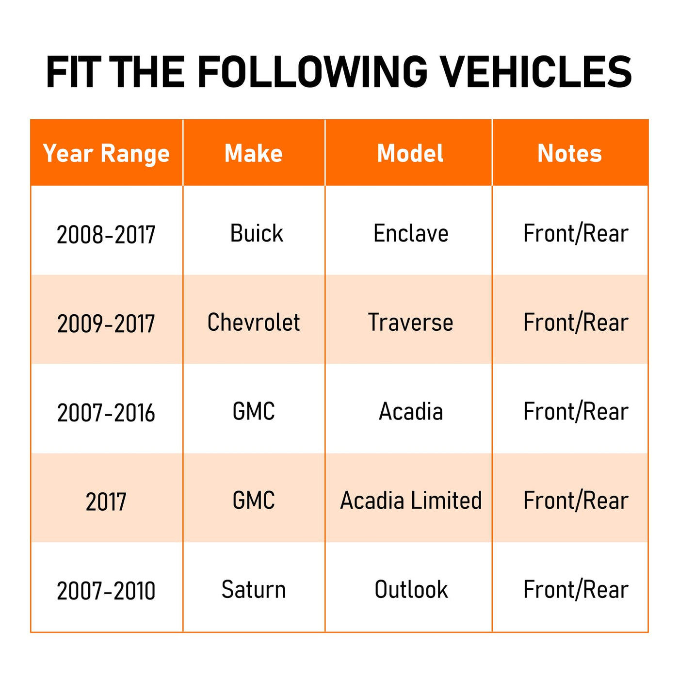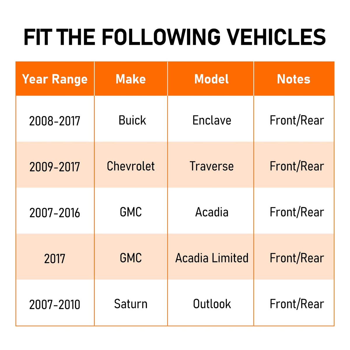 Q: What vehicles are compatible with the MACEL 513277 Wheel Bearing and Hub Assembly?A: The MACEL 513277 Wheel Bearing and Hub Assembly is compatible with the following vehicles: 2008-2017 Buick Enclave, 2009-2017 Chevy Traverse, 2007-2016 GMC Acadia, 2017 GMC Acadia Limited, and 2007-2010 Saturn Outlook. Be sure to check the fitment details to ensure compatibility with your specific vehicle model.