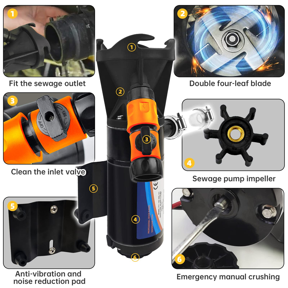 Macerator Pump for RV is a powerful and efficient solution designed to enhance your RV experience by simplifying waste management. This 12V 12GMP RV Macerator Pump features a quick-release function, allowing for easy sewage disposal with minimal effort. Ideal for use in marine environments, campers, kitchens, and bathrooms, this pump is a must-have accessory for any recreational vehicle.