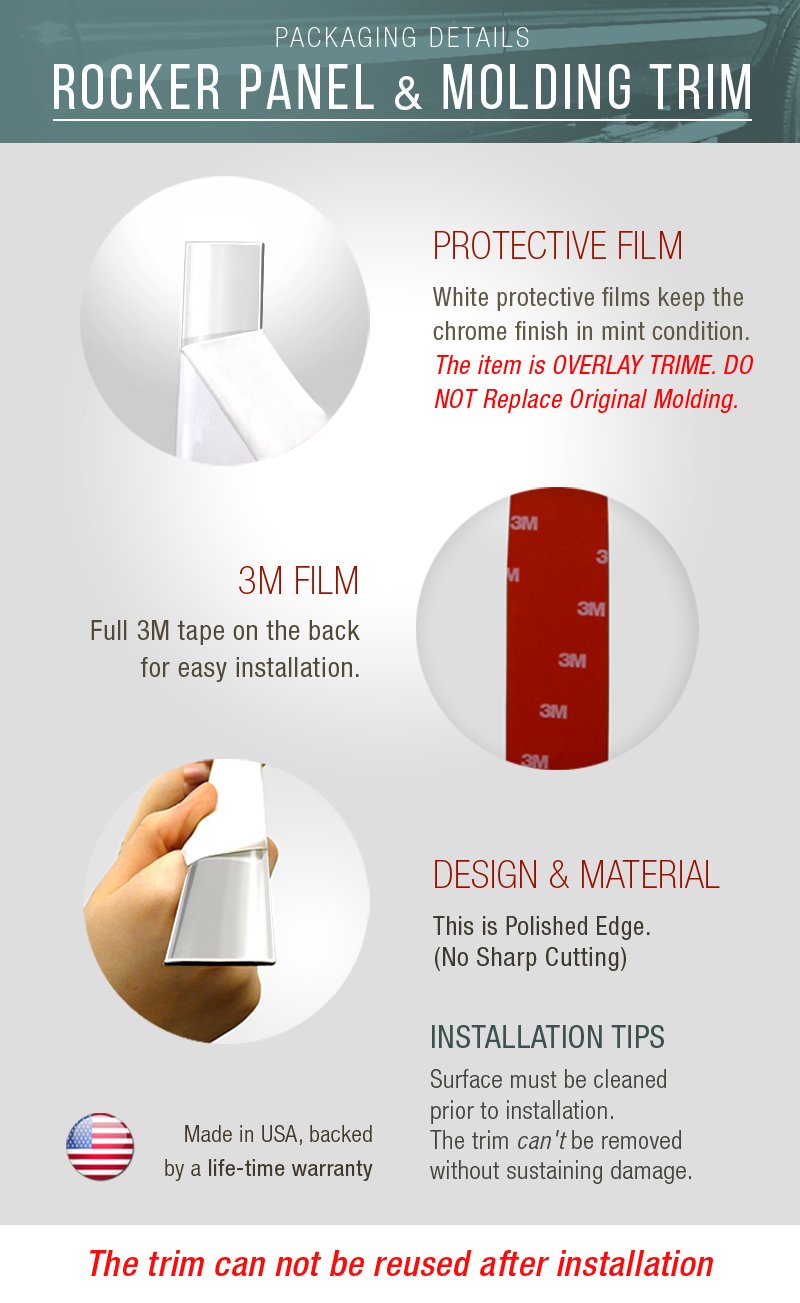 Q: What warranty does this product come with?A: This rocker panel trim is made in the USA and is backed by a lifetime warranty against manufacturing defects, providing peace of mind with your purchase.