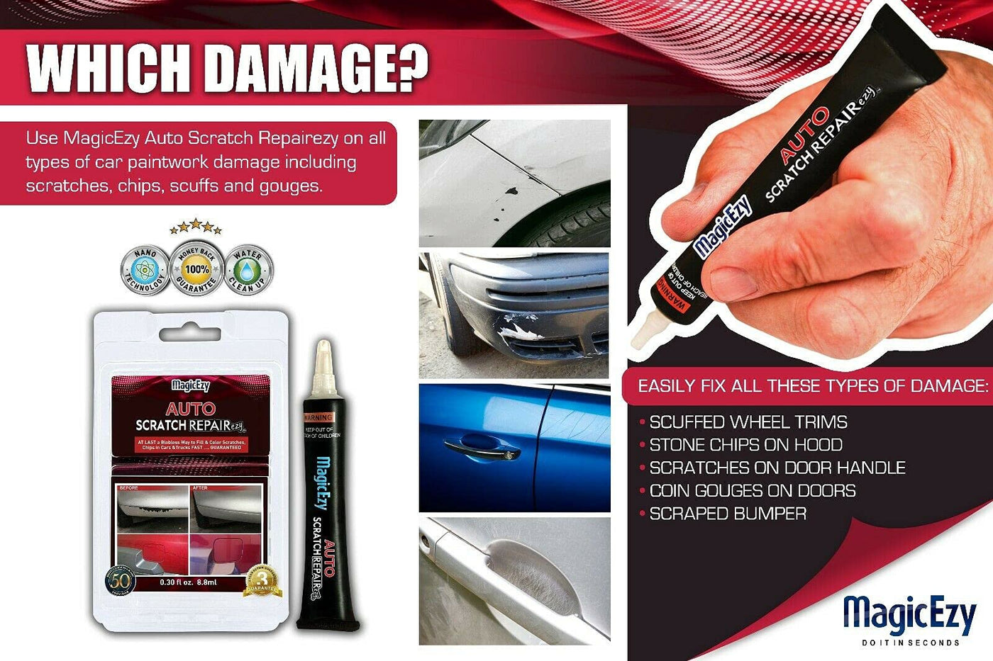 At last an accurate, drip-free way to repair car scratches, nicks and gouges on. auto paint without the drips, runs and blobs. And without buying the wrongly matched paint color. MagicEzy Auto Scratch RepairEzy enables you to achieve a precise color match and a virtually invisible repair regardless of the make or model of your vehicle or the location of the damage. With one of our 2 tube kits you can simply mix and match the colors so they match the precise shade of your car paint. Choose from silver, grey metallic, black metallic, white pearl metallic, black, and white repair kits. WHY MAGICEZY AUTO SCRATCH REPAIREZY 2. A superior color match: Off-the-shelf manufacturer-matched touch-up paints usually arent a perfect match to your car. Our kits make it easy for you to mix and match so you can achieve a virtually invisible repair. 3. Easy repairs that last The product is the brainchild of the worlds pioneer in auto touch-up repair systems.