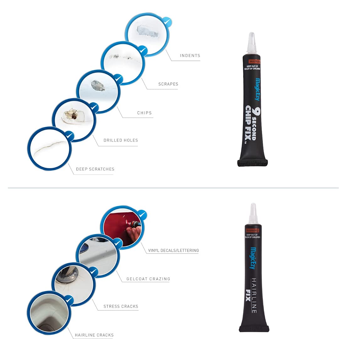 Hairline Fix Is A Super Easy, Super Powerful Way To Fix Fine Cracks And Scratches In Fiberglass Boats And Other Fiber Glass Surfaces. It'S A Glossy, All-In-One, Colored Gelcoat Repair Filler That Can Fix Minor Cracks, Chips And Scratches In Minutes. Use It To Repair All ‘Above The Waterline’, Fiber Glass Areas Of Your Boat, Jet Ski, Canoes Or Any Other Water Vehicle. It Also Bonds To Acrylic, Wood, Ceramic, Porcelain, And Enamel. It Can Also Be Used To Repair Hulls, Decking, Spas, Pipes, Poles, Cars, Motorcycles And Anything With A Fiberglass, Acrylic, Pvc Or Carbon Fiber Surface. It'S Both A Gelcoat Paint, Filler And Sealant In One Tube. There'S No Need To Mix Multi-Part Epoxy Solutions. There'S Also No Need To Sand The Surface Or Buff It. Simply Clean The Area, Apply, Level And Wipe. That'S It. If You Haver Larger Damage, Try Our 9 Second Chip Fix Product. 9 Second Chip Fix Is Magicezy'S 'Deep Damage' Solution For Virtually Any Surface. For Plastic-Like Surfaces Such As Acrylic, Pvs, Carbon Fiber, Just Prime The Surface First Using Magicezy Megafusion. This Will Strengthen The Area And Prevent The Repair From Peeling Or Popping Out.