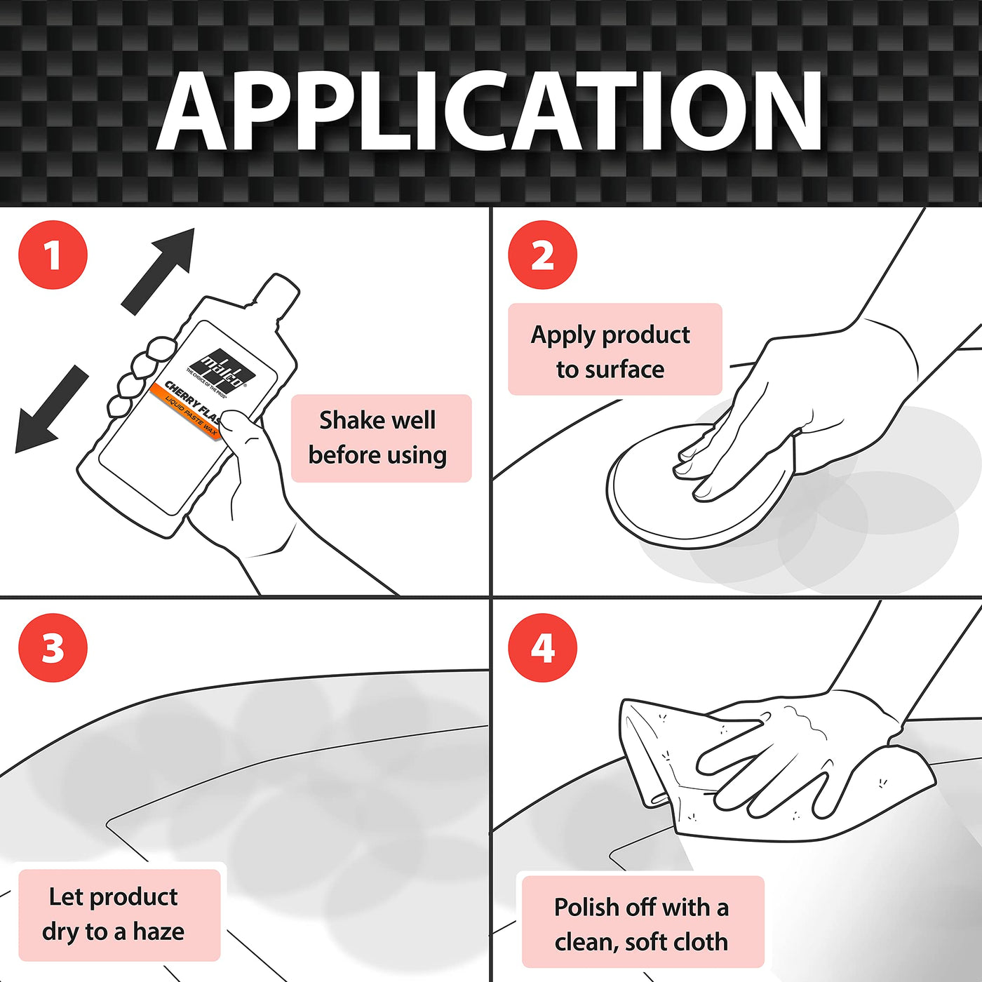 Q: How do I apply Malco Cherry Flash Liquid Paste Wax?A: To apply, first wash and dry your vehicle thoroughly. Shake the product well, then use a wax applicator pad to apply it to the surface. Allow it to dry to a haze before polishing off with a clean, soft cloth. For best results, apply on a cool surface and out of direct sunlight.