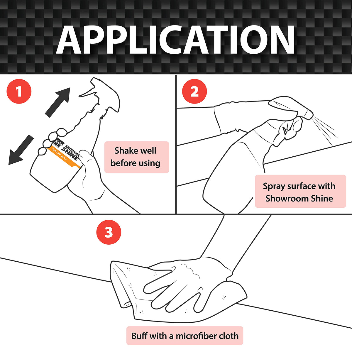Q: How do I use Malco Showroom Shine Spray Car Wax?A: To use Malco Showroom Shine, shake the bottle well before spraying. Apply the product on dusty or smudged surfaces and wipe clean using a microfiber cloth for a deep, protective shine.
