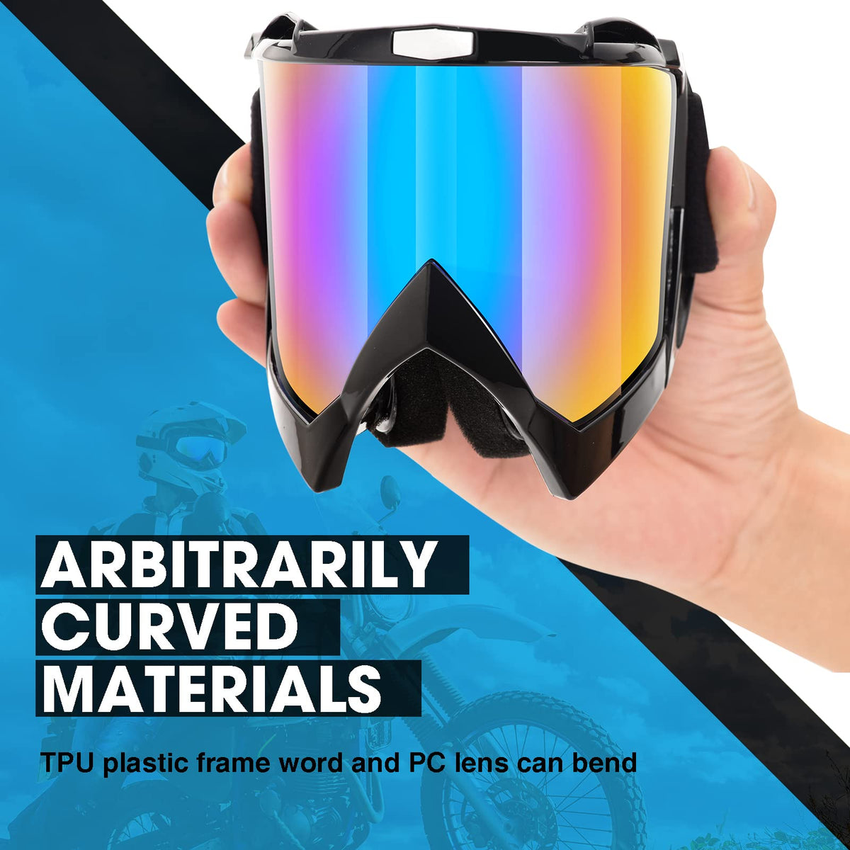 Q: What makes the MAMBAOUT Adult Dirt Bike Goggles suitable for various outdoor activities?A: The MAMBAOUT Adult Dirt Bike Goggles are designed with a lightweight and bendable TPU frame, making them flexible and comfortable for various outdoor activities such as motocross, skiing, and climbing. They feature a high-quality PC lens that provides UV 400 protection, anti-fogging capabilities, and excellent impact resistance, ensuring safety and comfort during use.