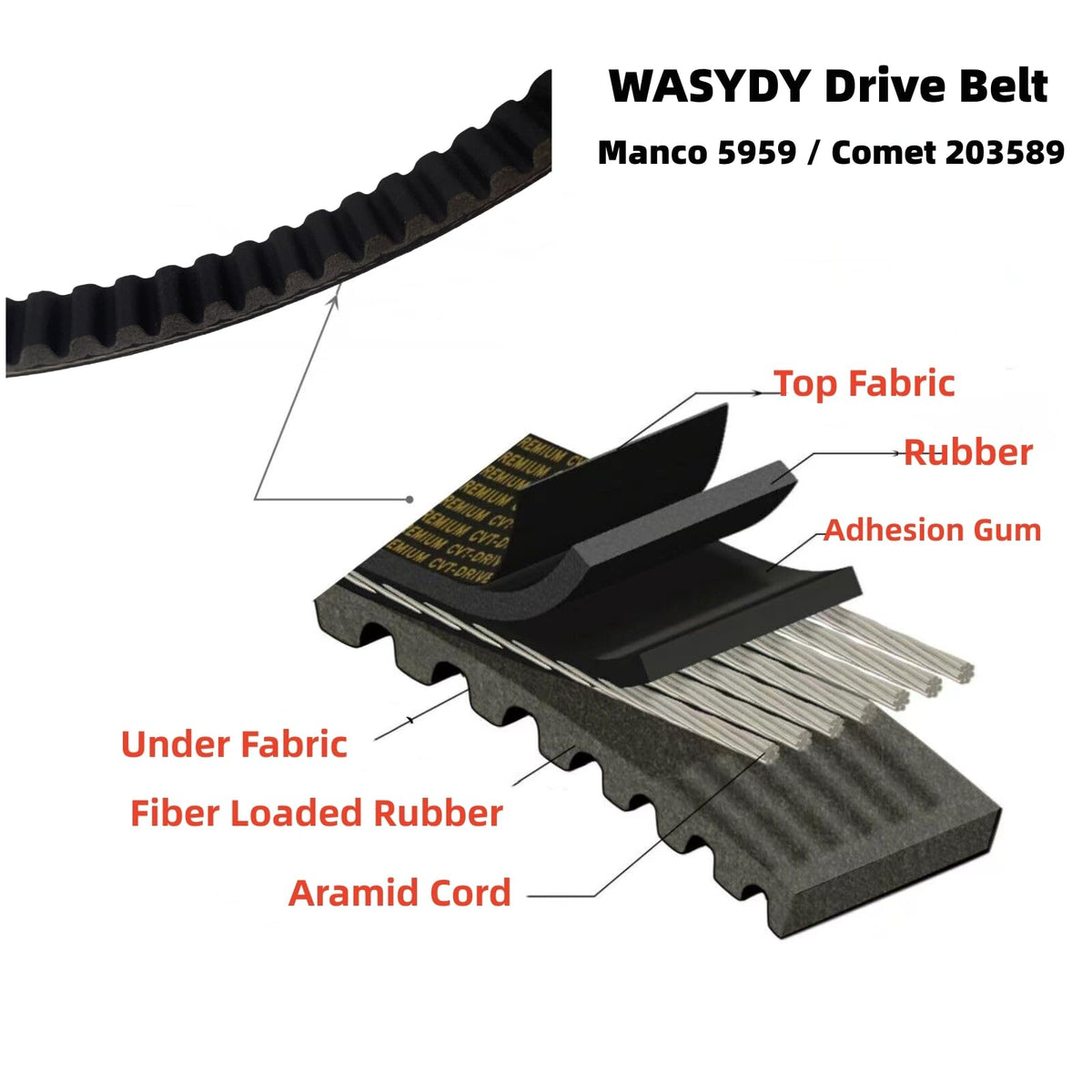 Q: What materials are used in the Manco 5959 Replacement Go Kart Belt?A: The Manco 5959 Replacement Go Kart Belt is manufactured using durable materials that are designed to withstand the rigors of go-karting. While it is not an OEM part, it is built to meet or exceed the performance of the original equipment.