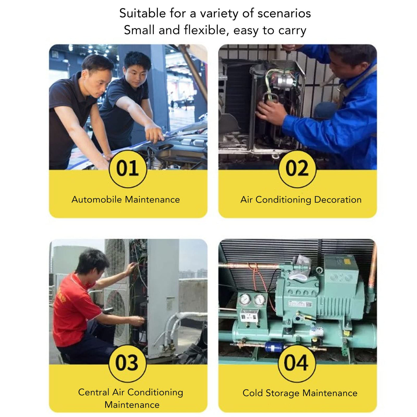 Q: How do I properly use the manifold gauge for air conditioning maintenance?A: To use the manifold gauge, connect it to the refrigerant service port of the air conditioning system you're working on. Ensure the valve structure is in the off position before attaching. Once connected, you can monitor the pressure and diagnose issues effectively.