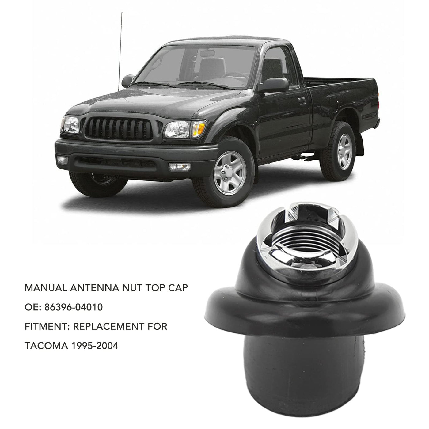 Q: Is this antenna nut top cap compatible with all Tacoma models?A: This manual antenna nut top cap is specifically designed as a replacement for Tacoma models from 1995 to 2004. Please confirm your vehicle's model and year before purchasing to ensure compatibility.