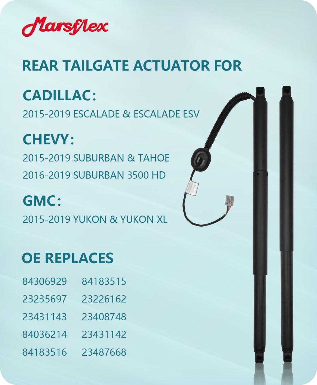 Q: What vehicles are compatible with the Marsflex Rear Tailgate Power Lift Support Shock Strut?A: The Marsflex Rear Tailgate Power Lift Support Shock Strut is compatible with various models, including the 2015-2019 Cadillac Escalade and Escalade ESV, 2015-2020 Chevrolet Suburban and Tahoe, 2016-2019 Suburban 3500 HD, and 2015-2019 GMC Yukon and Yukon XL.