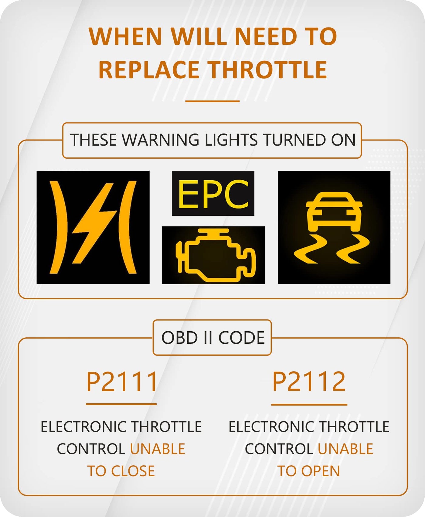 Q: What should I do if my vehicle's electronic throttle control light comes on?A: If the electronic throttle control light illuminates, it may indicate an issue with the throttle body. Symptoms like engine stalling, hesitation, or power surging during acceleration can occur. It's advisable to have the throttle body inspected or replaced if necessary.
