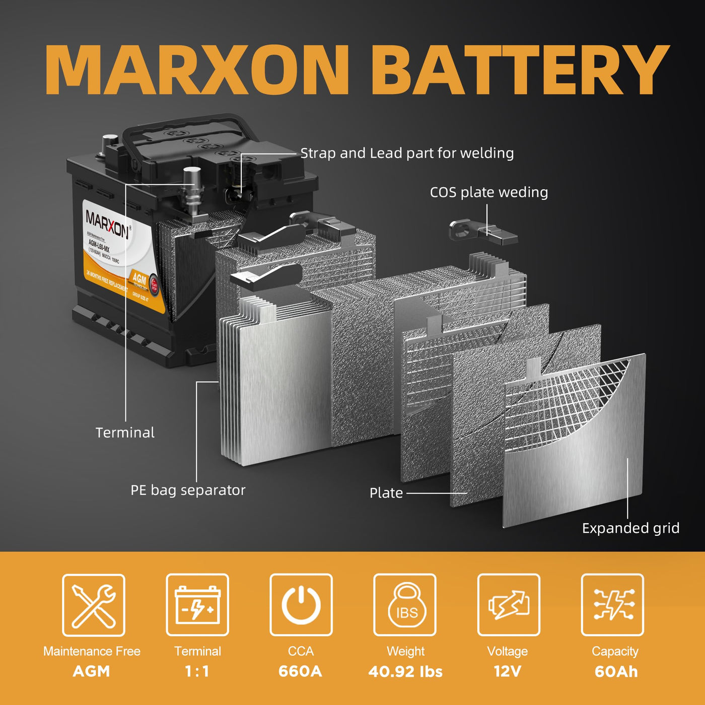 MARXON Group 47 H5 L2 Start and Stop Car Battery 12v 60AH 660CCA AGM BCI47 Maintenance Free Automotive Replacement Batteries