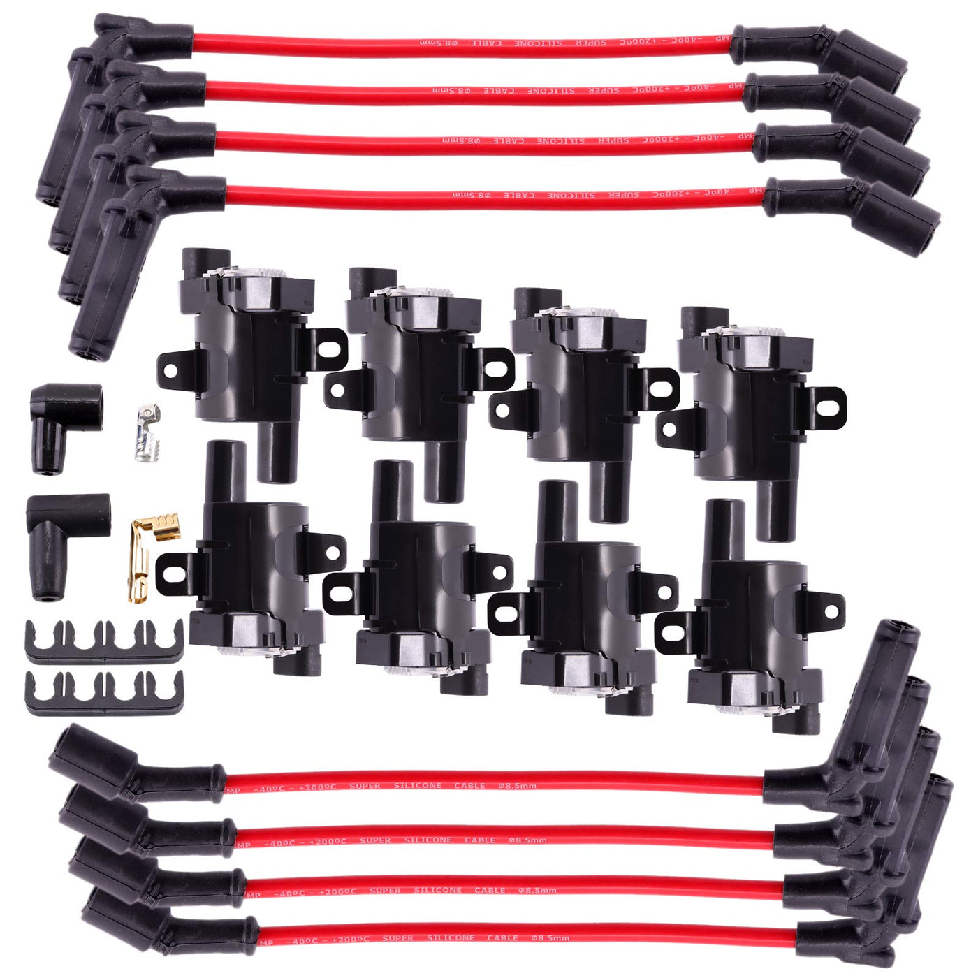 MAS Set of 8 Round Ignition Coils Pack UF262 & 748UU 8.5mm Spark Plug Wire Set Compatible with Chevy Hummer H2 Cadillac GMC Yuko