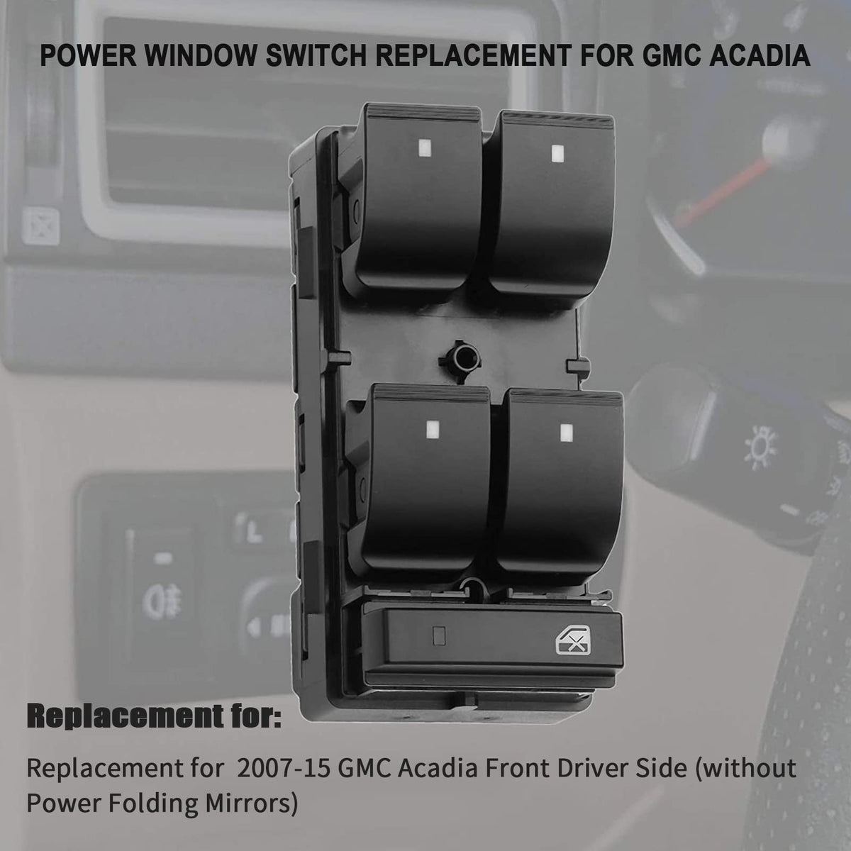 Features:Brand New & High-Quality Parts (Not Genuine). According To The Original Factory Specifications. Strict Quality Control Standards To Build And Test. Design Improved For More Durability, Stable And Updated Characteristics, High Reliability. Perfect Match And Direct Replacement Of Original Parts. Specifications: Crafted From Superb Plastic, With Great Strength And Qualitymake Smooth Lifting Of Car Window With Original Illuminating Lightswill Not Fit Models With Power Folding Mirrorssurface Finish: Black, Otherwarranty: 1 Yearinterchange Part Number: Manufacturer Part Number: 20945224Interchange Part Numbers: 10390508, 25789239, D1930F 901-990, D1961Fcompatible With:2007-15 Gmc Acadia Front Driver Side (Without Power Folding Mirrors) Package Include:1Pc X Power Window Switch.