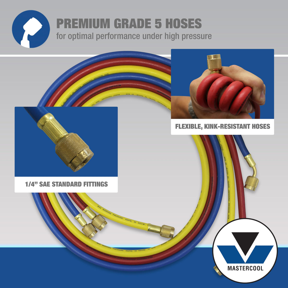 Mastercool 59136 Product DescriptionMastercool 59136 - Standard 2-Way Brass Manifold Gauge Set for HVAC/R Systems (R22, R404A, R410A)? Professional-Grade Performance & DurabilityThe Mastercool 59136 is a high-quality manifold gauge set designed for **HVAC and refrigeration professionals** servicing **R22, R404A, and R410A systems**. Built with a **forged brass body**, this durable tool ensures **long-lasting reliability** for **both residential and commercial applications**. With **large, easy-to-read gauges** and **high-pressure hoses**, the 59136 delivers **precise pressure readings and smooth operation** in any environment.? Key Features & BenefitsHeavy-Duty Forged Brass Construction - Built to **withstand daily wear and tear**, ensuring **exceptional durability and extended product life**. Refrigerant Compatibility - Designed for **R22, R404A, and R410A refrigerants**, making it a **versatile tool for HVAC and refrigeration systems**. Precision 3 1/8 Silicone-Dampened Gauges - Reduces **needle vibration**, providing **stable and accurate pressure readings** for **reliable diagnostics**. Premium Grade 5 High-Pressure Hoses - Includes **three 36 kink-resistant, flexible hoses** with ** SAE standard fittings**, utilizing **advanced rubber technology** for **optimal performance under high pressure**. Advanced Free-Floating Piston Valves - Reduces **internal wear and friction**, significantly extending the **lifespan of O-rings** for **smoother and more reliable operation**. Angled, All-Metal Handles for Enhanced Control - Ergonomically designed for **comfortable grip and precise adjustments**, ensuring **smooth operation even under high pressure**. Compact & Portable Design - **Lightweight and space-saving**, making it an **ideal choice for technicians who require maneuverability and easy storage**.? Ideal for HVAC/R Professionals & TechniciansWhether you're servicing **residential, commercial, or industrial HVAC systems**, the Mastercool 59136 delivers **exceptional accuracy and durability** for **reliable A/C and refrigeration maintenance**.Upgrade your HVAC toolkit with the Mastercool 59136 - Built for Precision, Durability, and Efficiency!