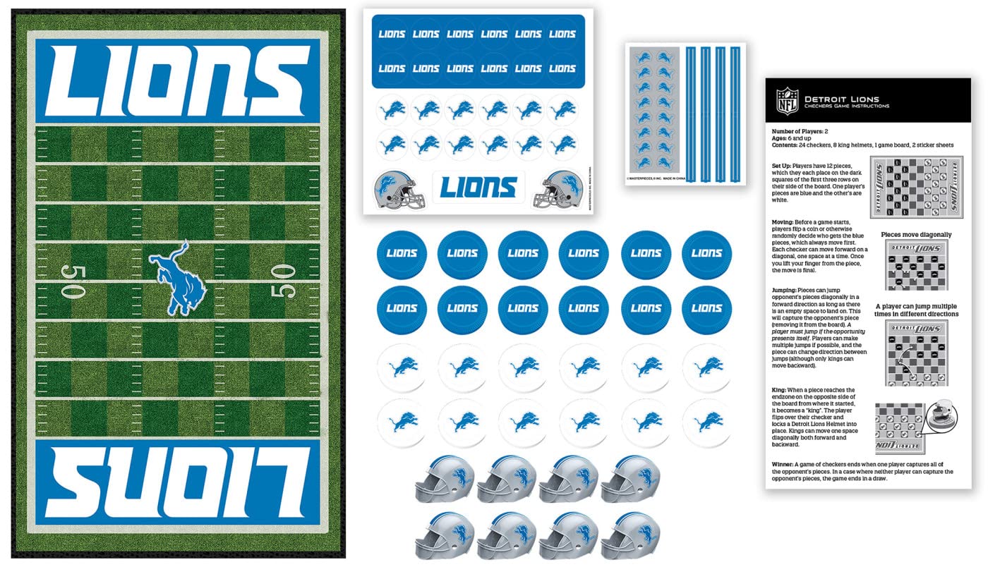 This MasterPieces NFL Detroit Lions Checkers Game is the classic game of checkers where the king wears a Detroit Lions football helmet! The Detroit Lions checkers game includes 24 Detroit Lions checkers pieces, 8 Detroit Lions football helmet king pieces, a 13'' x 21.375'' Detroit Lions game board, 1 sticker sheet, and an instruction sheet.