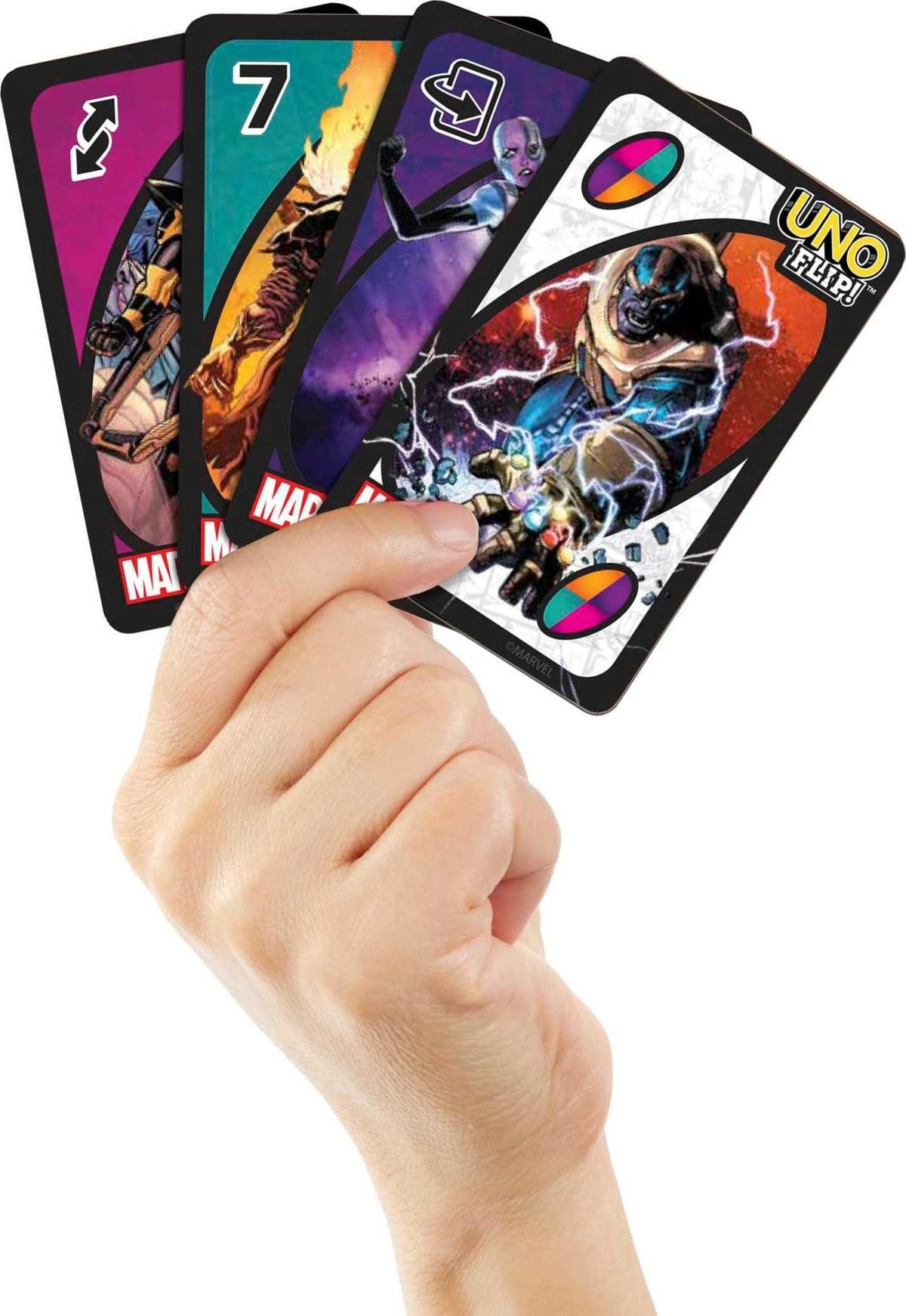 UNO Flip! card game adds an exciting twist to the classic UNO matching card action that everyone loves, and now the action includes heroes and villains from the Marvel universe! Play a Flip card and the deck FLIPS from the Heroes' side to the Villains' side which has penalties that are extra tough. A 'Draw 1' card on the Heroes' side becomes a 'Draw 5' card on the Villains' side! A Heroes' side 'Skip' card becomes a Villains' side 'Skip Everyone' card! Only another Flip card can change things back. And when you're down to one card, don't shout, 'assemble,' shout, 'UNO!' This edition of the family-favorite card game makes a great toy for players 7 years and older, especially Marvel fans. Colors and decorations may vary.