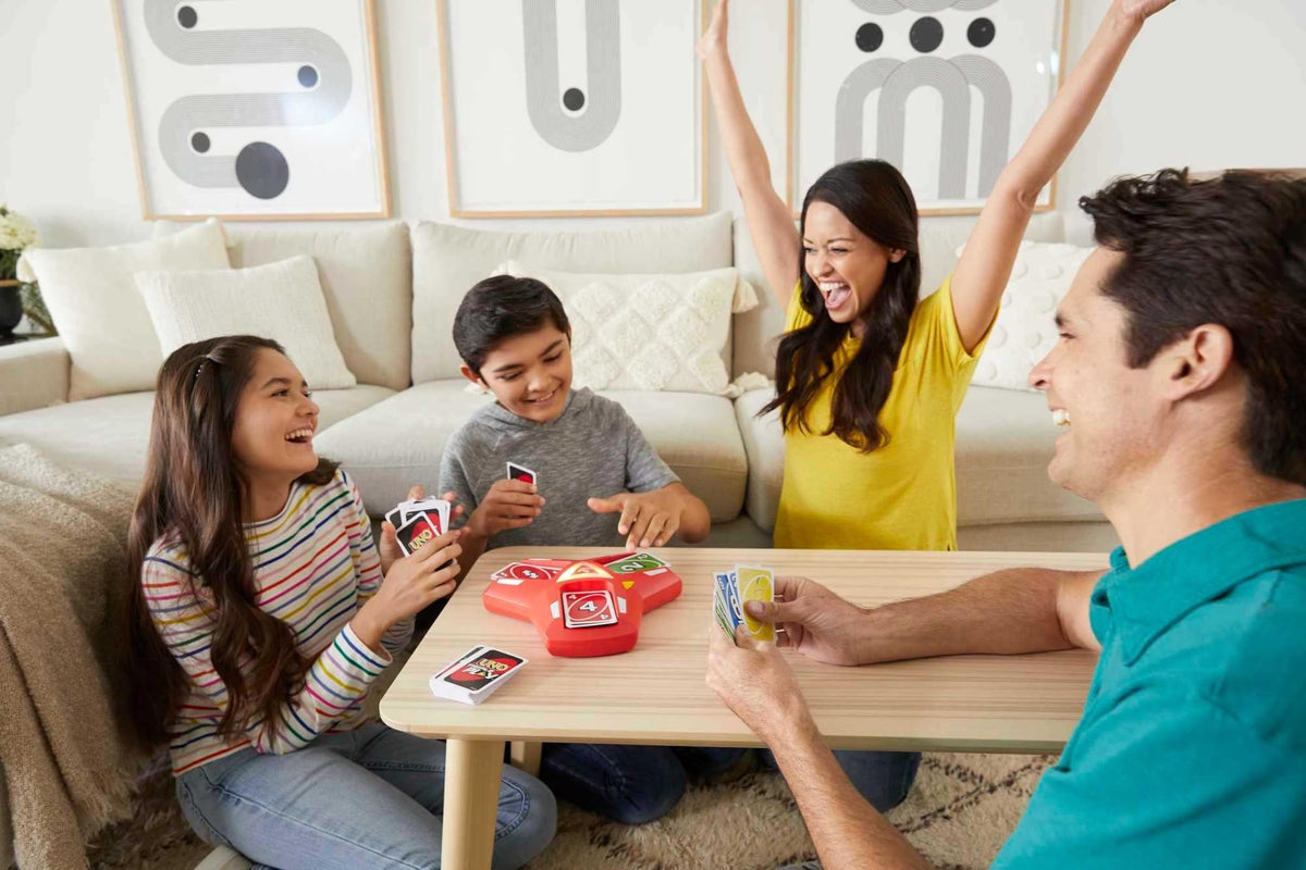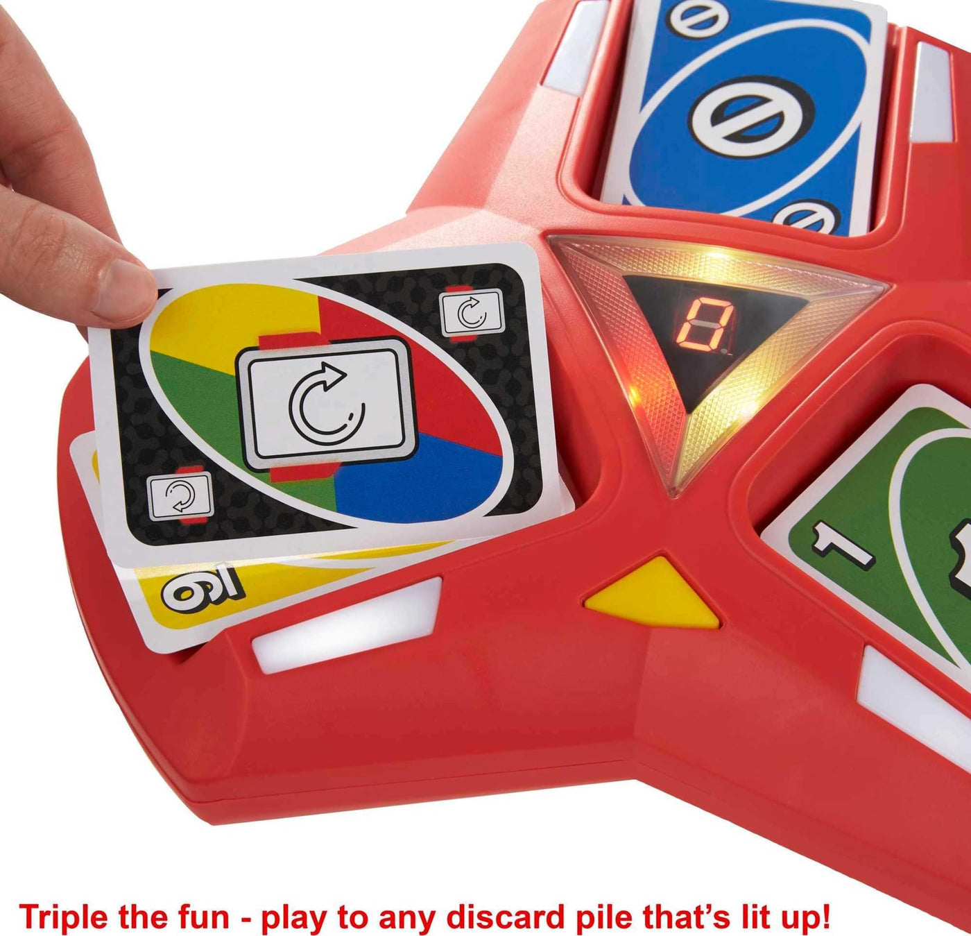 The UNO Triple Play game is three times the fun, with this special unit that holds three discard piles and features exciting lights and sounds for suspense and surprise! Game play is like classic UNO, but players may only discard to any pile(s) that are lit up on their turn. And if any pile gets too many cards in it, it may OVERLOAD! If it does, the LED display dictates how many cards must be drawn! Lights and arcade sounds on the machine create maximum anticipation and excitement, and the ''Timer Mode'' makes the game move even faster! It's a new way to play the game every card-playing crew already loves. When players have only one card left, they must yell ''UNO!'' Colors and decorations may vary.