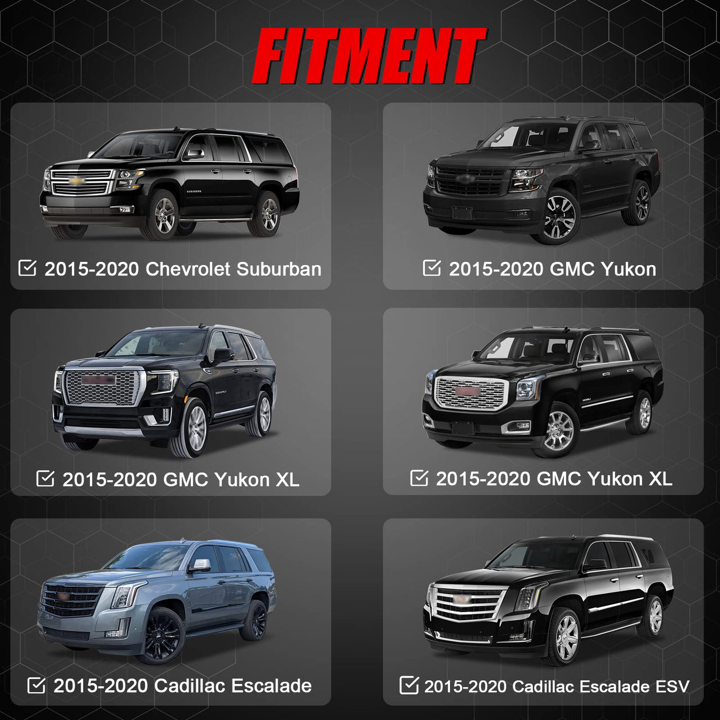 ?FITMENT? Compatible with 2015-2020 Chevy Suburban & Tahoe, GMC Yukon & Yukon XL, Cadillac Escalade & Escalade ESV (WITH SIDE ROOF RAILS) | ?DURABLE CONSTRUCTION? Constructed of corrosion-resistant materials to withstand extreme weather conditions, The set of cross bars is lockable to ensure maximum security | ?FUNCTION? Roof rack can be used to carry kayaks, canoes, luggage, skis, bikes, camping gear, etc, Expands carrying capacity of your vehicle | ?EASY INSTALLATION? All hardware included, no tools or assembly required | ?PURCHASE WITH CONFIDENCE? TEMSONE offers 1 year product quality support to our customers,If you are uncertain of any problems, please contact us