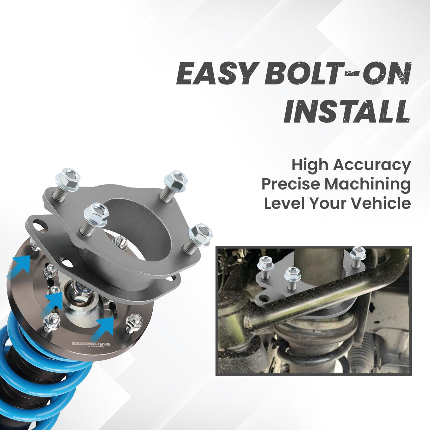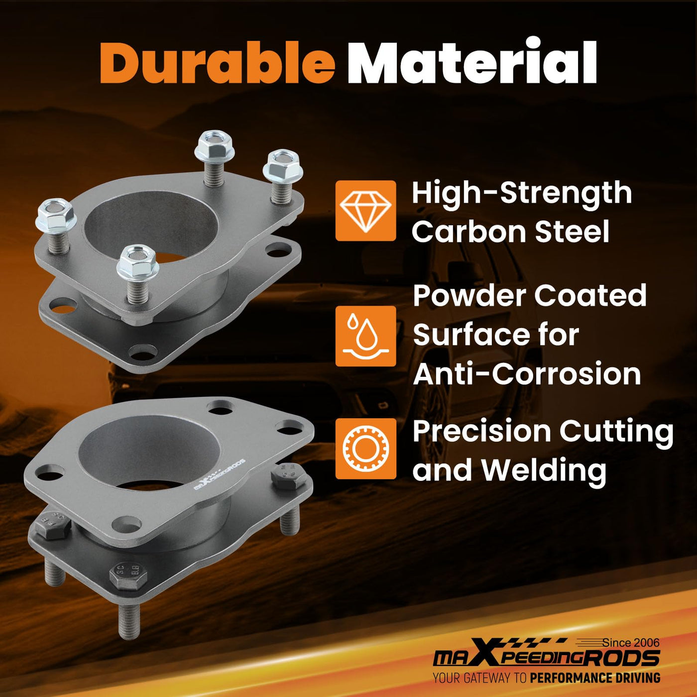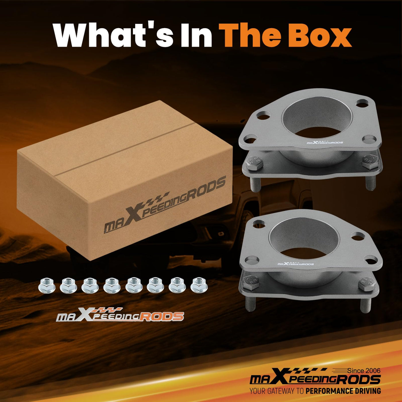 maXpeedingrods 2'' Front Lift Kit APPLICATIONS: For Jeep Liberty KJ KK 2002-2012 For Dodge Nitro 2007-2012 Increase Clearance: Front lift kit is designed to raise the car suspension away from the axles to conquer on and off-road obstacles Add extra clearance, allowing you to change to larger wheels and tires for a customized look Level Your Car: This leveling kit for Jeep raises the front end so it matches the stock height in the back Provide a more leveled look Maintain Ride Comfort: This suspension lift spacer kit will not affect your factory ride quality and comfort level Perfect for on road and off road driving Bolt-on Install: Strut spacers can be bolted onto the top of struts, you don't need to disassemble the struts SPECIFICATIONS: Type: Leveling Lift Kit Condition: Brand New Material: Steel Lift Height: 2'' Spacer Thickness: 45mm Lift Position: Front Tire Size: 31'' Max PACKAGE CONTENTS: 2 x Front Lift Spacers Mounting Hardware NOTE: * This lift kit will raise the front by 2 inches, lift height does not equal spacer height due to geometry * Please allow 1~3mm error due to manual measurement