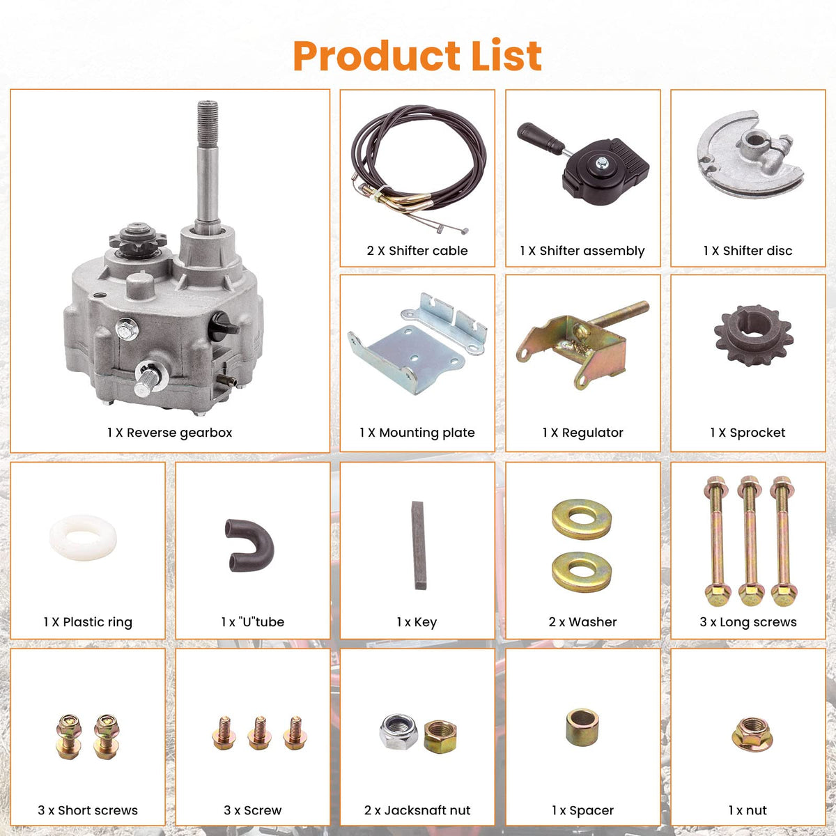 Applications Forward Reverse gearbox is for go-karts, utility vehicles and other applications with engines up to 11HP Fit for # 35 chain 12T and # 40/41/420 chain 10T (Both sprockets included) Note: Please note only use on 30 SERIES Specifications Material: Metal Shaft Size: 5/8'' with 3/16'' keyway Shaft size: for driven clutch is 5/8'' with 3/16'' keyway Forward Ratio: 1:1:3 Reverse Ratio: 1:2:6 Gearbox Speed: 5/13 of the Clutch speed Shifter Cable Length: 1540mm ( 5' ) ( 60'' ) Package Contents 1 X Forward / Reverse Gearbox with 3/16'' Keyway 2 X Mounting Plates 1 X Shifter Disc 2 X Shifter Cable 1 X 10T and 12T Sprocket 1 X Shifter Assembly Tips This product was filled with oil before leaving the factory When the oil is used up, it needs to be filled to half of the box This go-kart gearbox is use GL-5 gear oil Note Instruction not include, professional installation is recommended If you need the insatllation instruction pls contact us