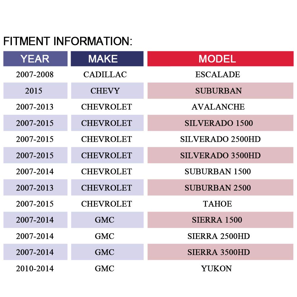 Q: What vehicles are compatible with the MAYASAF Amber Lens Fog Light?A: The MAYASAF Amber Lens Fog Light is compatible with a variety of vehicles including the 2007-08 Cadillac Escalade, 2007-15 Chevy Silverado 1500/2500HD/3500HD, 2007-14 Chevy Suburban, 2007-13 Chevy Avalanche, 2007-15 Chevy Tahoe, and 2007-14 GMC Sierra 1500/2500HD/3500HD, among others.
