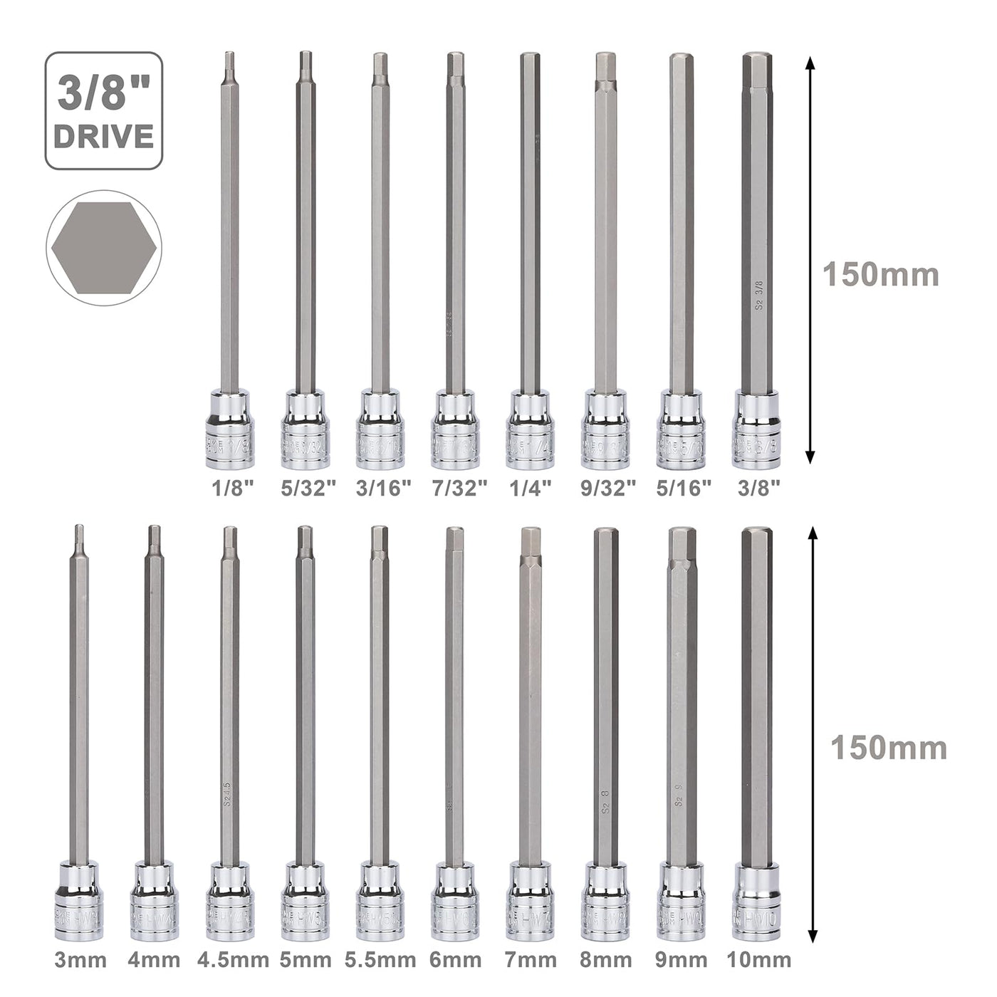 Mayouko 3/8" Drive Extra Long Allen Hex Bit Socket Set, S2&Cr-V, Metreic&Sae, 18 Pieces, 1/8" - 3/8", 3-10 Mm