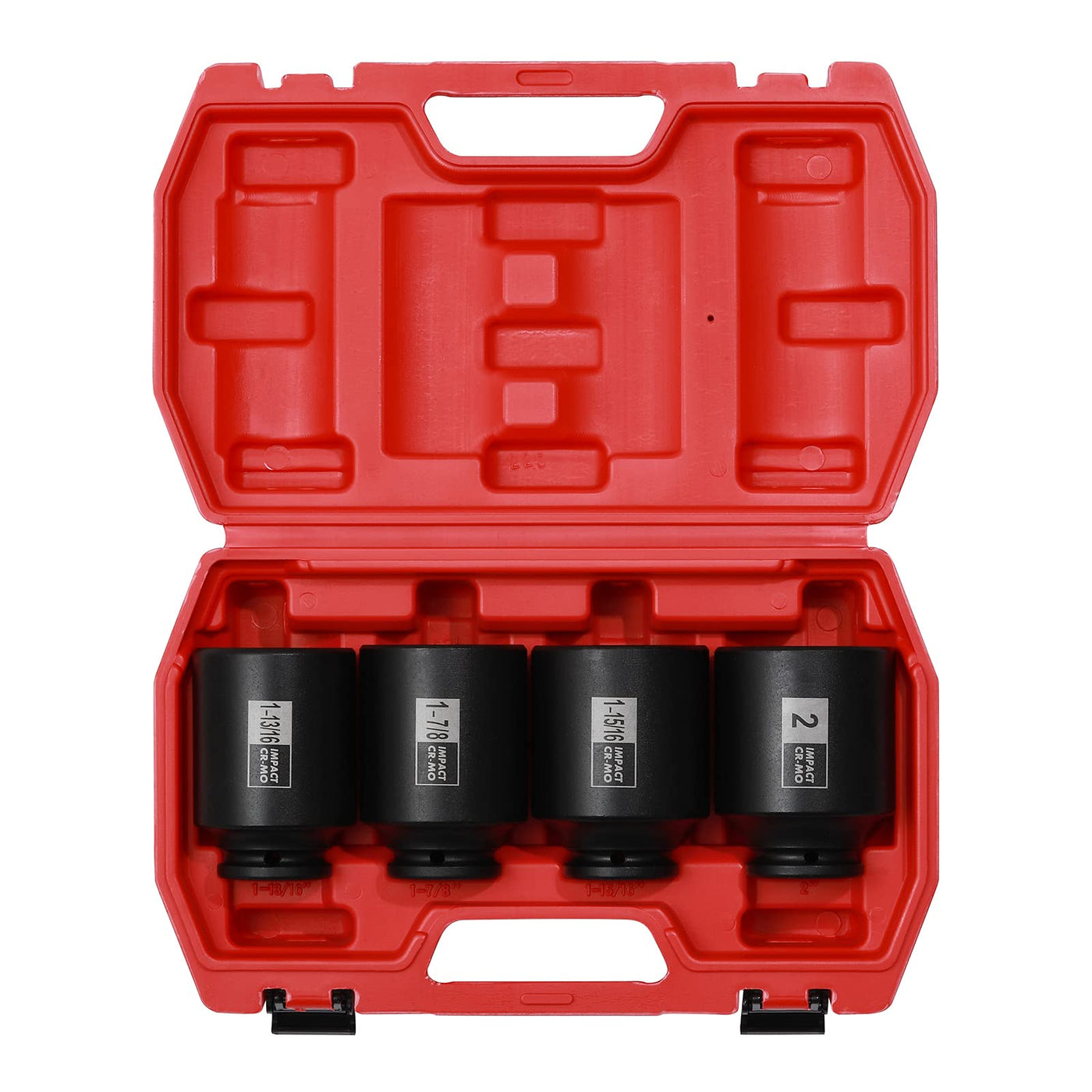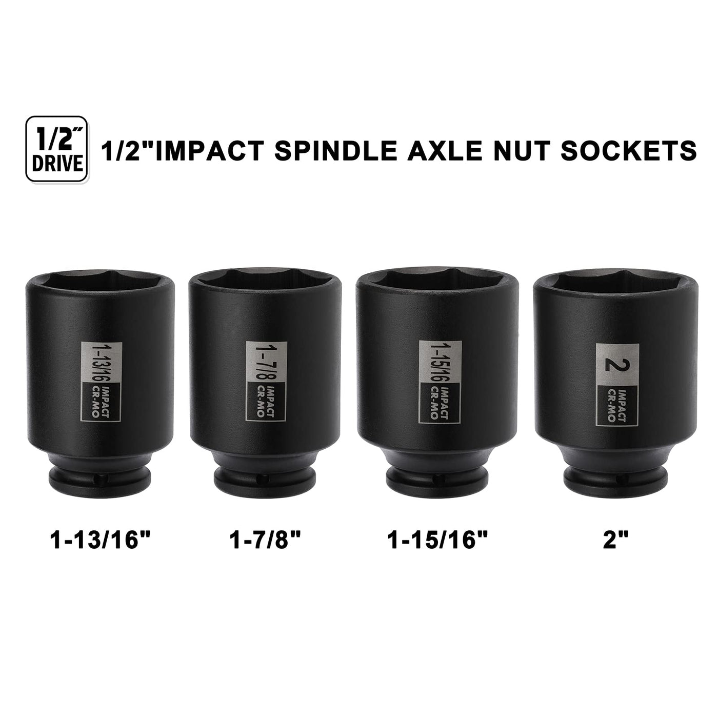 Q: What sizes are included in the Mayouko 4PCS 1/2" Drive Spindle Axle Nut Impact Socket Set?A: The Mayouko impact socket set includes four sizes: 1-13/16", 1-7/8", 1-15/16", and 2".
