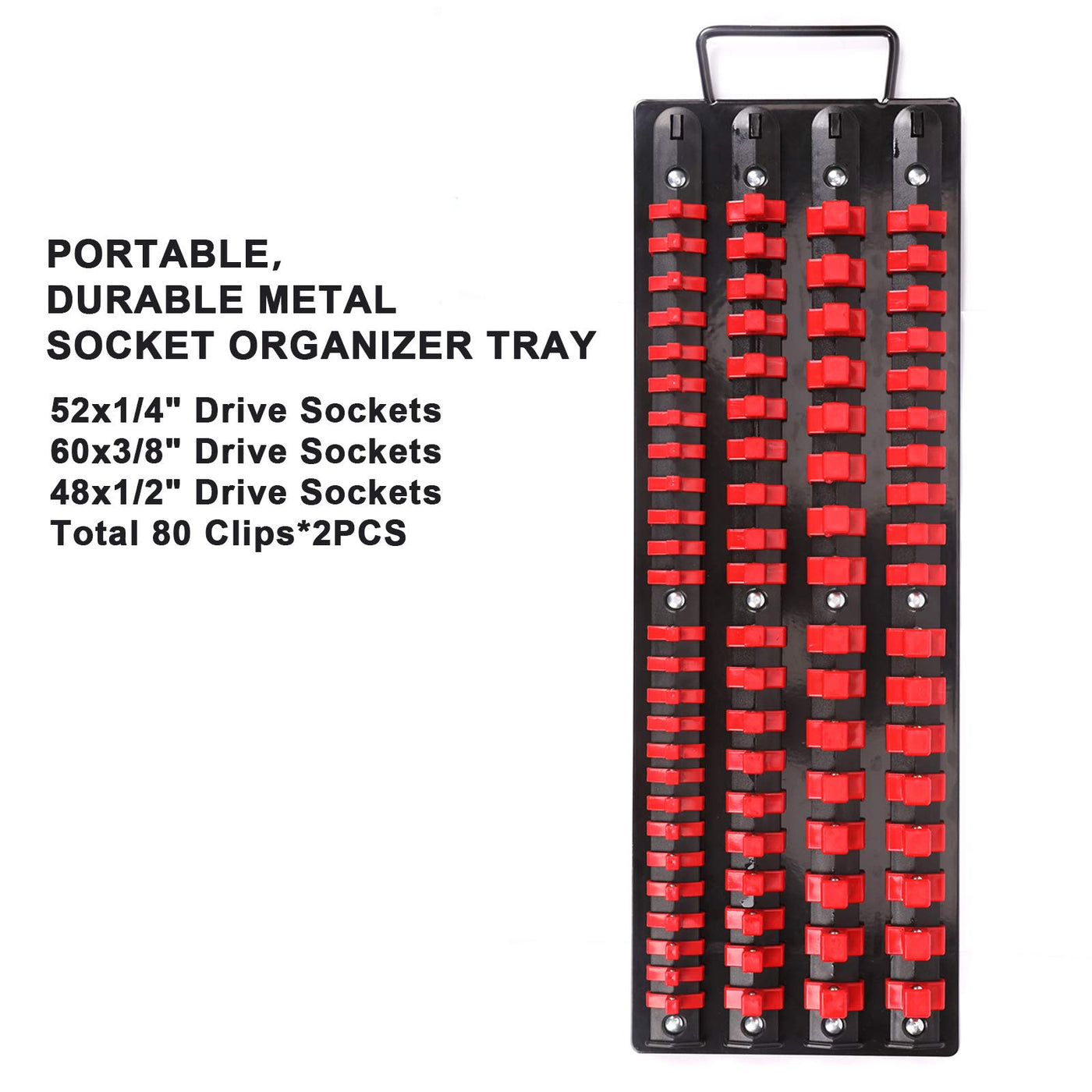 This Mayouko 80-Piece Portable Socket Organizer Tray, 2 Pcs Setit Is Designed For Storage In The Drawer, On The Bench, Or On The Go And It Could Holds 160 Sockets( 52 X 14 Clips, 60X 38A Clips, 48 X 12 Clips)The Clips Contain Spring-Loaded Ball Bearings For A Secure Hold, Even Upside Down, And The Clips Can Be Used On Both Sides Of The Rail For Double-Sided Usethe Heavy Duty Molded Abs Plastic Socket Clips Allow For Shallow Or Deep Sockets, Holds A Total Of 80 Socketsthe Socket Organizers Save Your Working Time, Keep The Workspace Clean And Make Sure You Will Not Lose Any Socket Againit Comes With 1 Year Quality Warranty