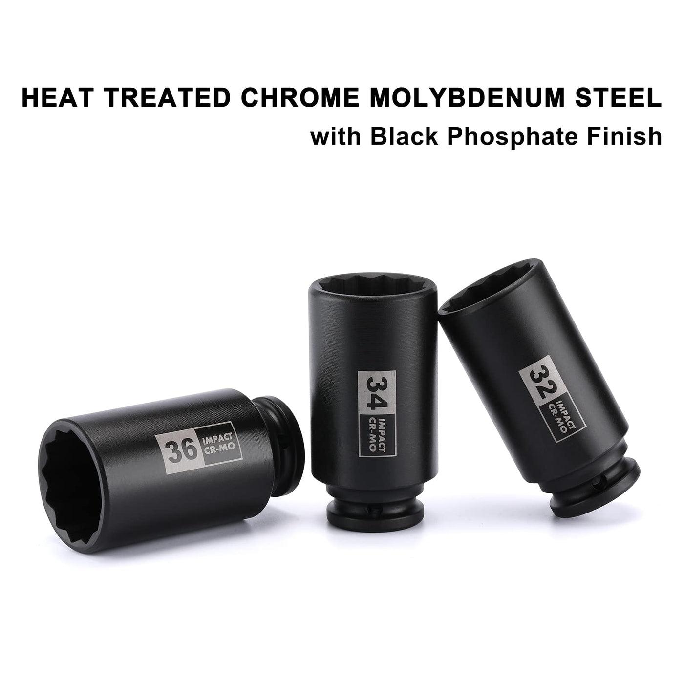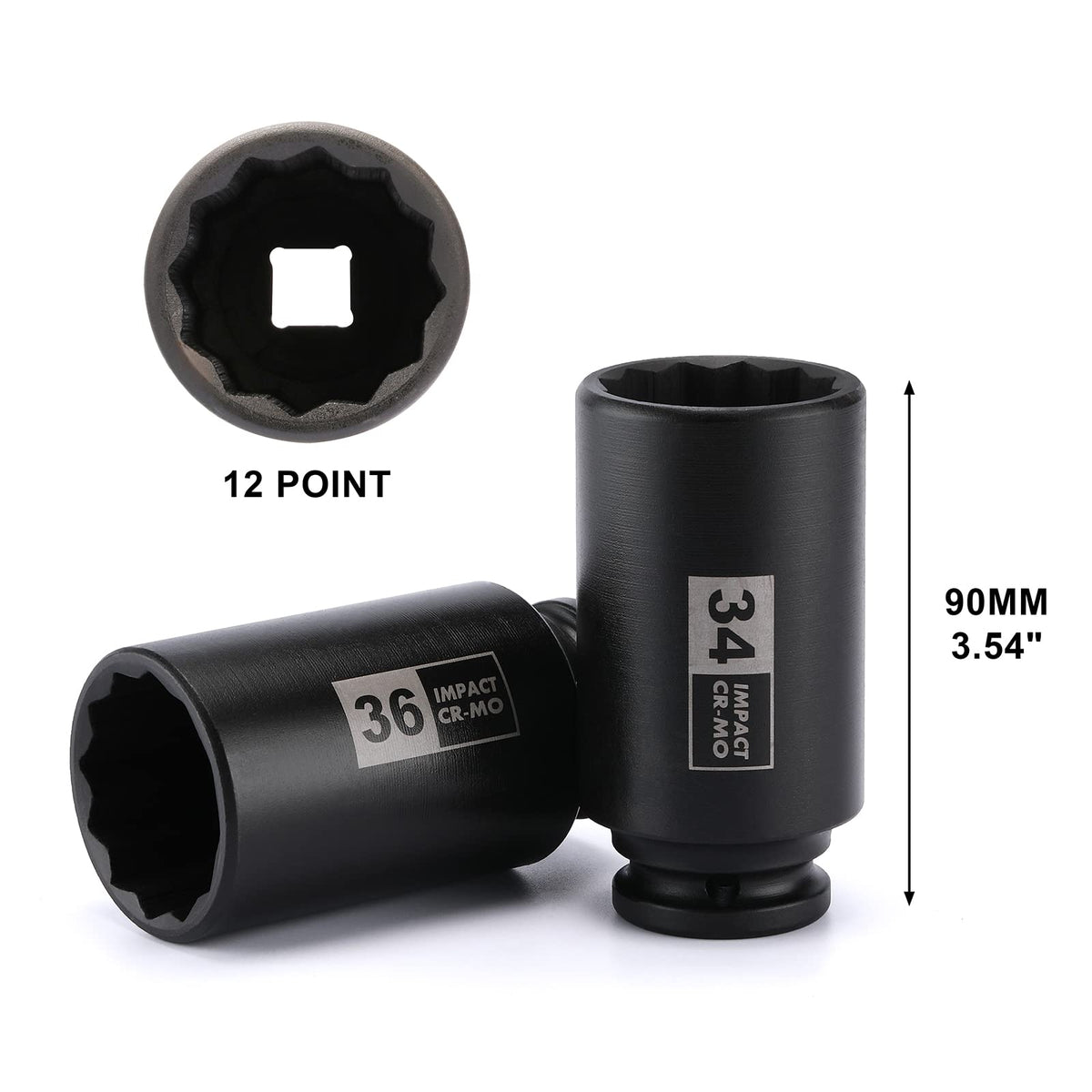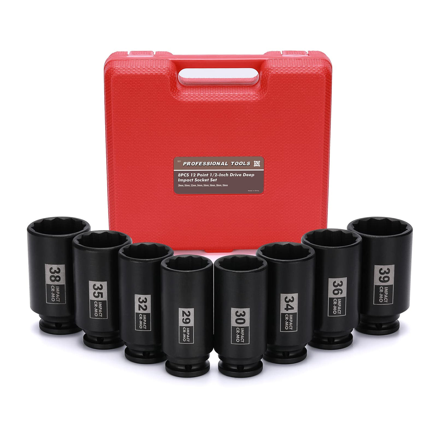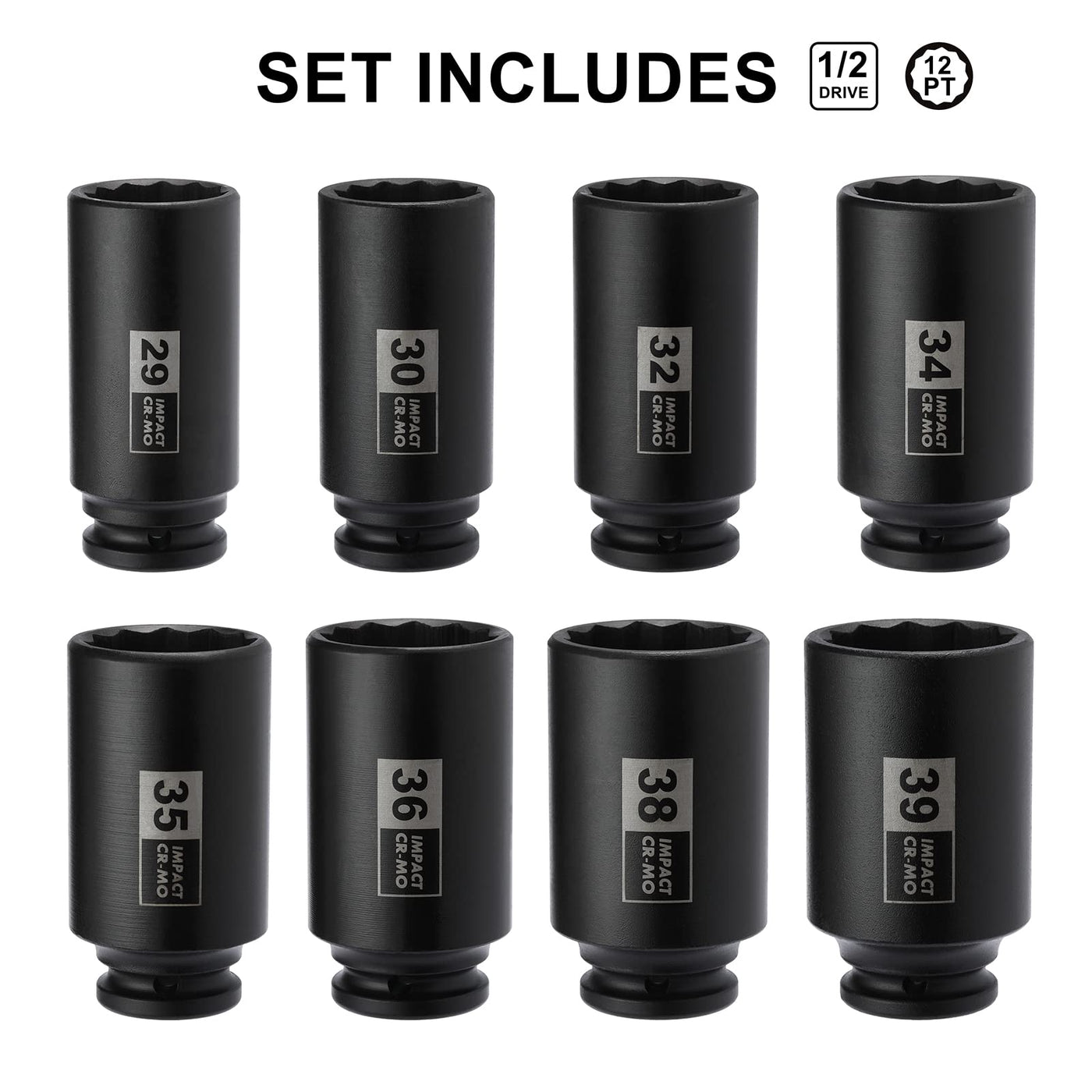 Mayouko 8Pcs 1/2" Deep Axle Nut Impact Socket Set, Cr-Mo, 12 Point Design, Metric, 29,30,32,34,35,36,38,39Mm, 1/2 Inch Extra Deep Impact Socket
