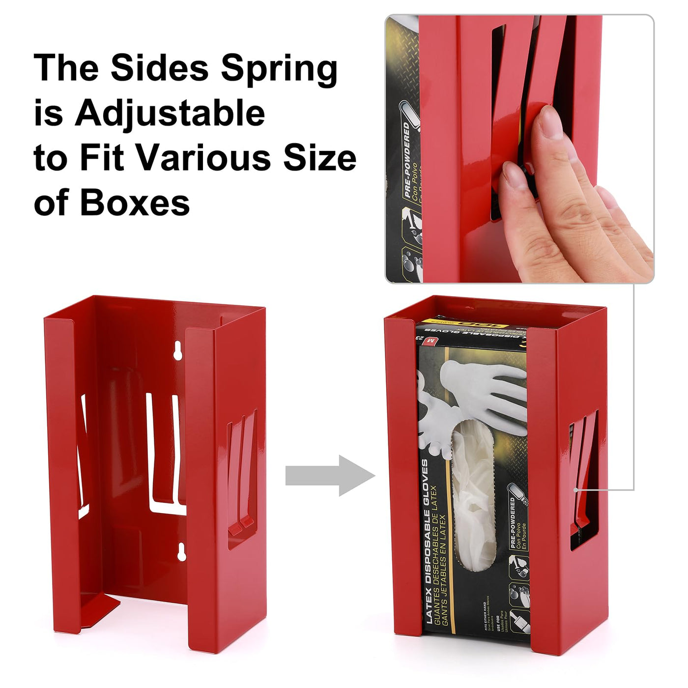 This Mayouko Magnetic Tissue and Glove Dispenser constructed of heavy duty steel in powder coated,which assures a long service life and resistant to rust and corrosion.Adjustable springs and magnets make the dipenser more convenient in your daily use.The glove holder with 2 wall mounting holes can be hung on the wall,which is very useful.
