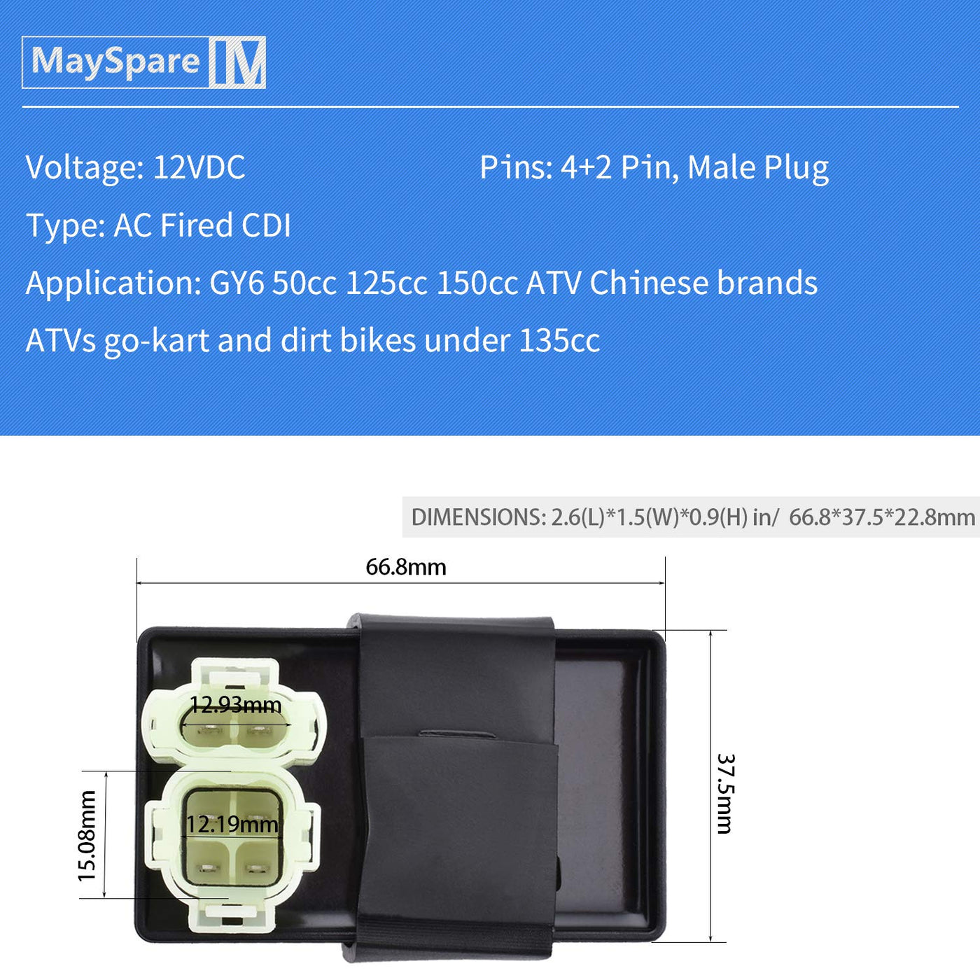 Q: Is the MaySpare CDI compatible with all GY6 engines?A: Yes, the MaySpare 6 Pin AC CDI BOX is compatible with GY6 engines ranging from 50cc to 150cc, making it suitable for various applications such as ATVs, scooters, mopeds, and go-karts.